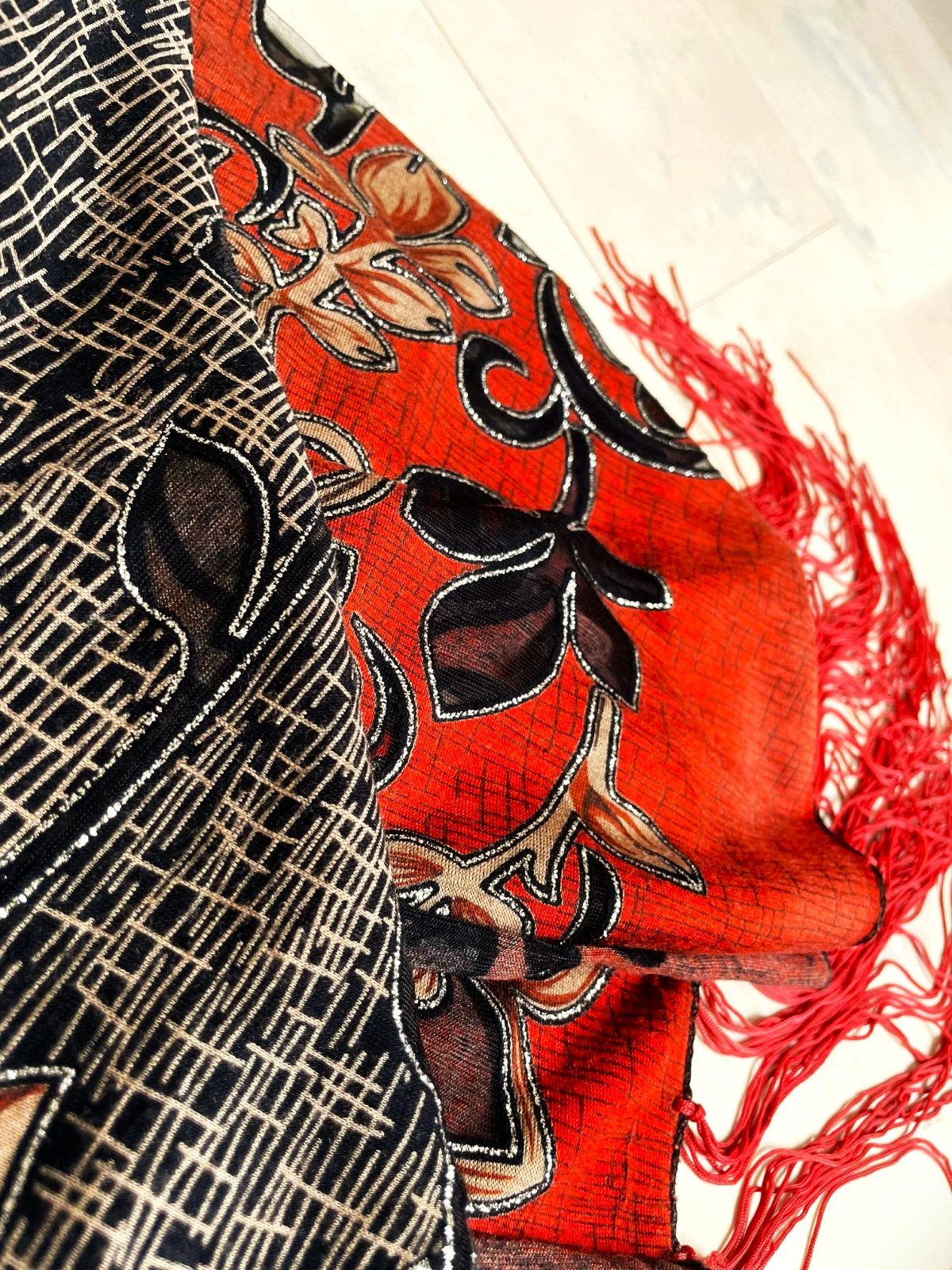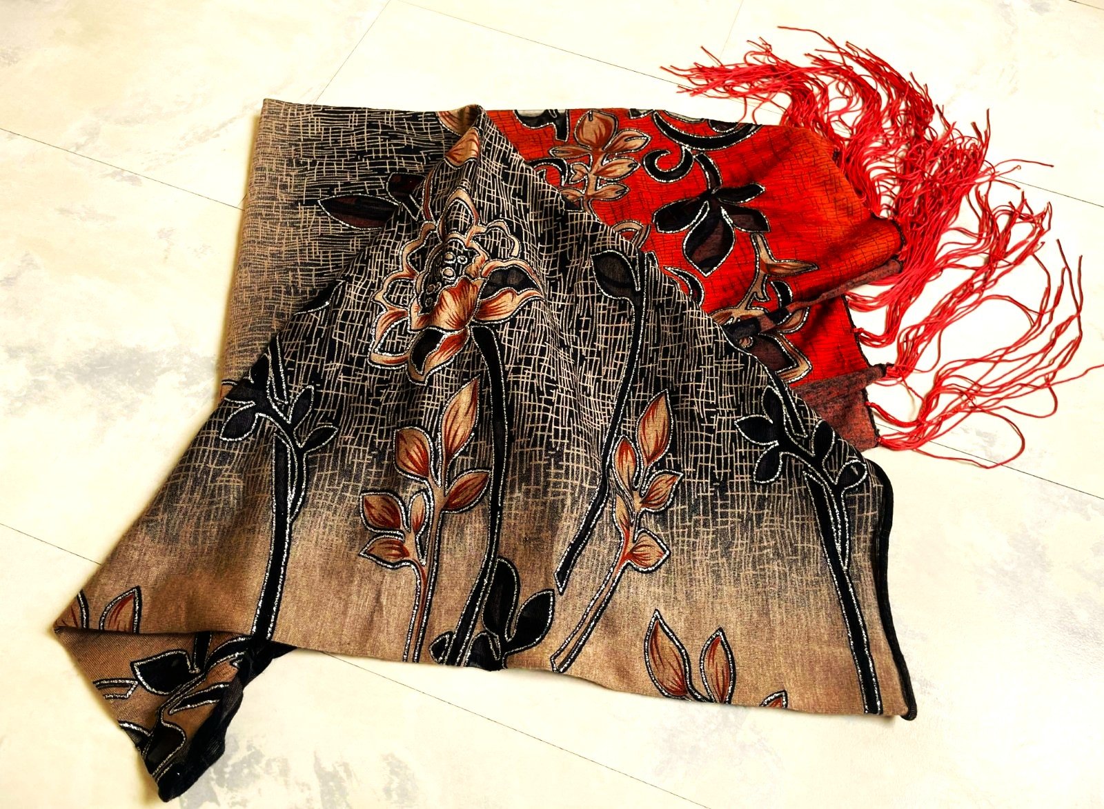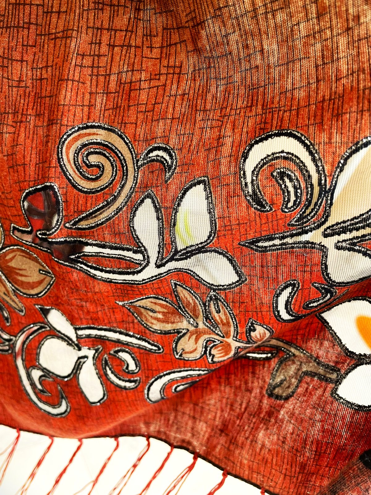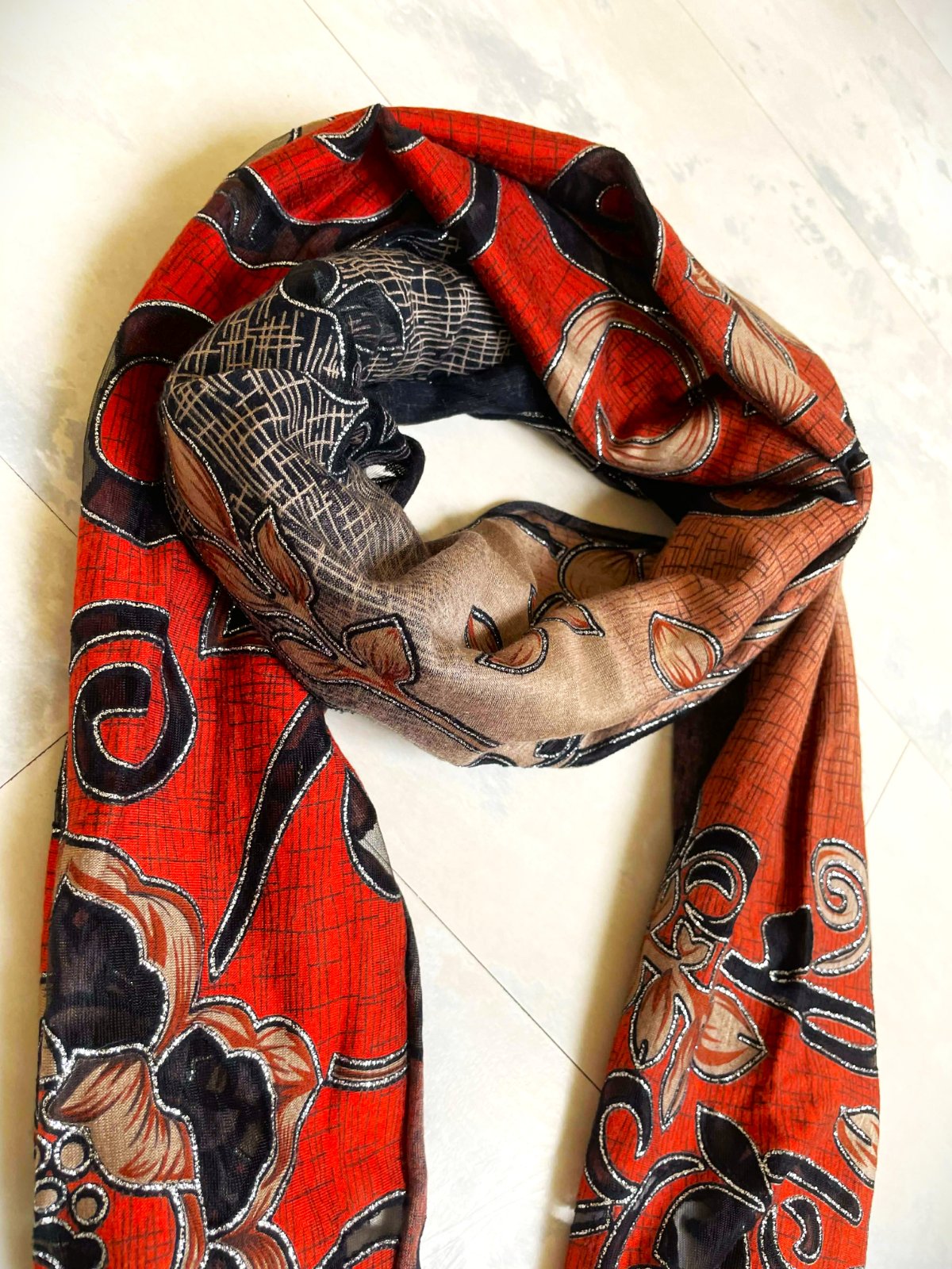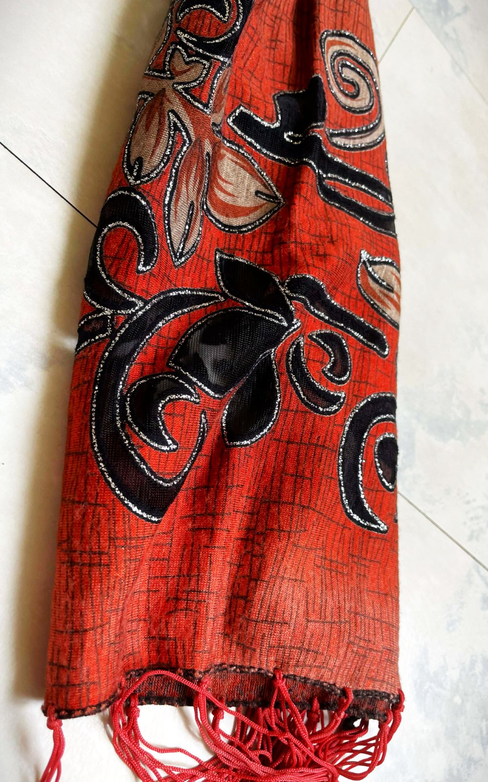 vysokokvalitná ľahúčka šatka okolo krku/ šál,dovezený z Talianska s talianskym dizajnom, ktorá sa vyznačuje jemnými vykrajovanými vzormi v jesenných zemitých farbách,vhodný aj na ramená,aj okolo krku,aj na večerné šaty,ale aj na bežné nosenie,šírka = 50 cm, dlžka = 150 cm,top luxusný a zaujímavý kúsok,vykrajované jemné vzory - niečo ako technika richellie,krásne jesenné zemité farby,je úplne nový,iba prepraný po skladovaní,nádherný darček....