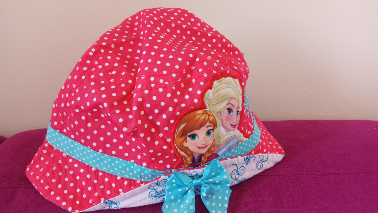 Krásny bavlnený klobúčik na leto pre parádnicu s motívom Frozen od Disney, nebol nosený, je nový s visačkami,veľkostne sedí na 2-5 rokov, obvod je uvedený 50 cm.