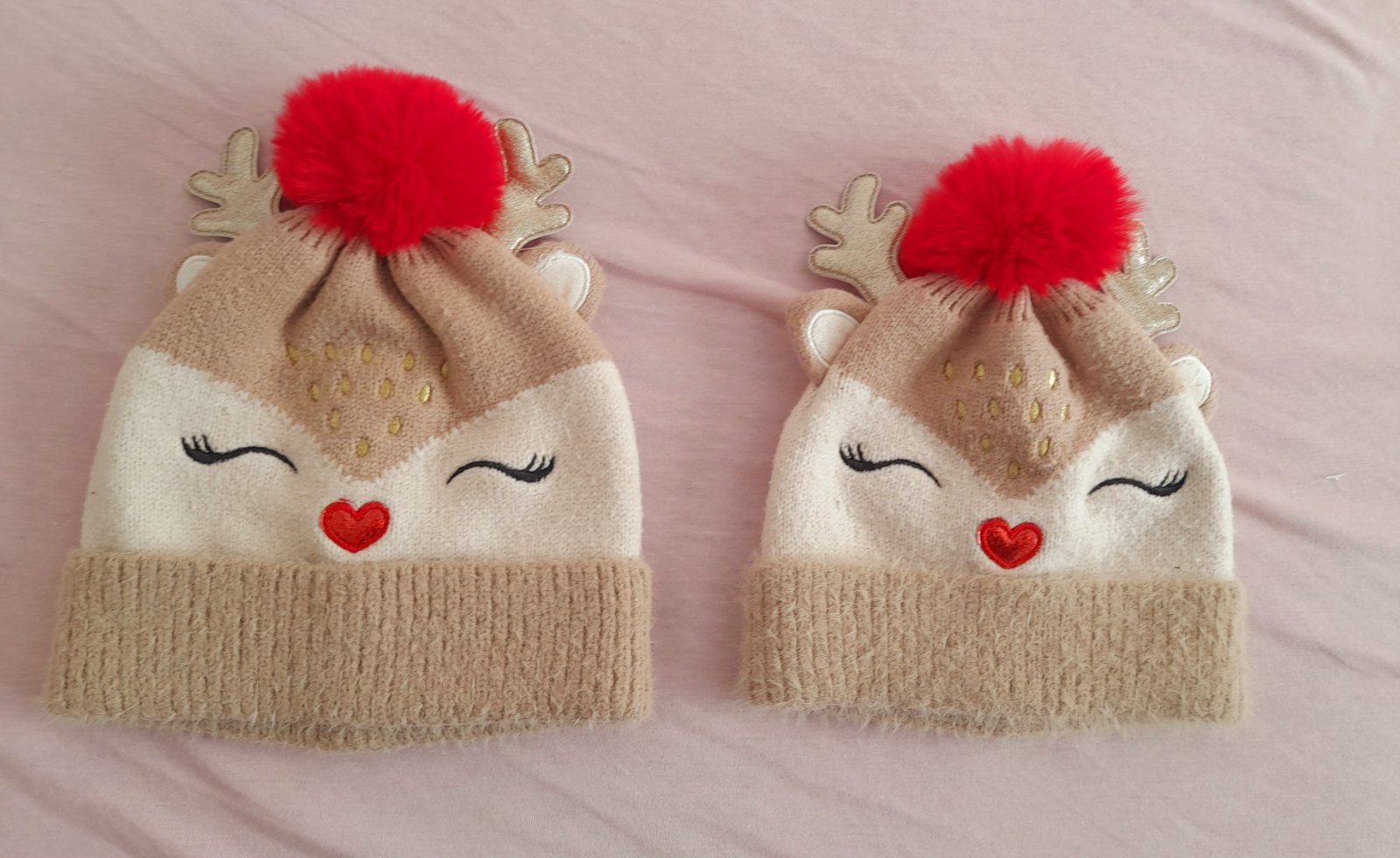 Vianočné čiapky vhodné pre súrodencov. Vhodné pre dieťa 3 roky a 6 rokov. Detaily uvedené na fotke. Cena 4€ za obidve spolu.