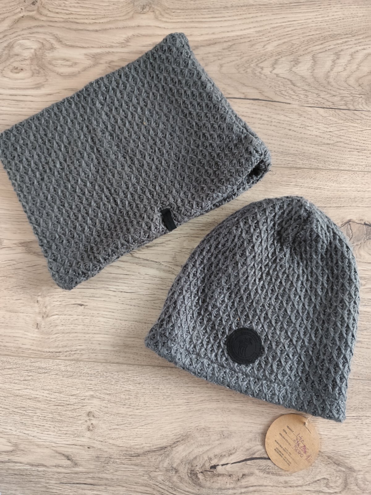 Nová súprava - čiapka a nákrčník, čiapka je z jednej vrstvy, nákrčník je "obojstranný", nám nesadla veľkosť. Tá je uvedená 1-4roky, ale je väčšia. Sadne na 3-7, možno aj viac... 98-122