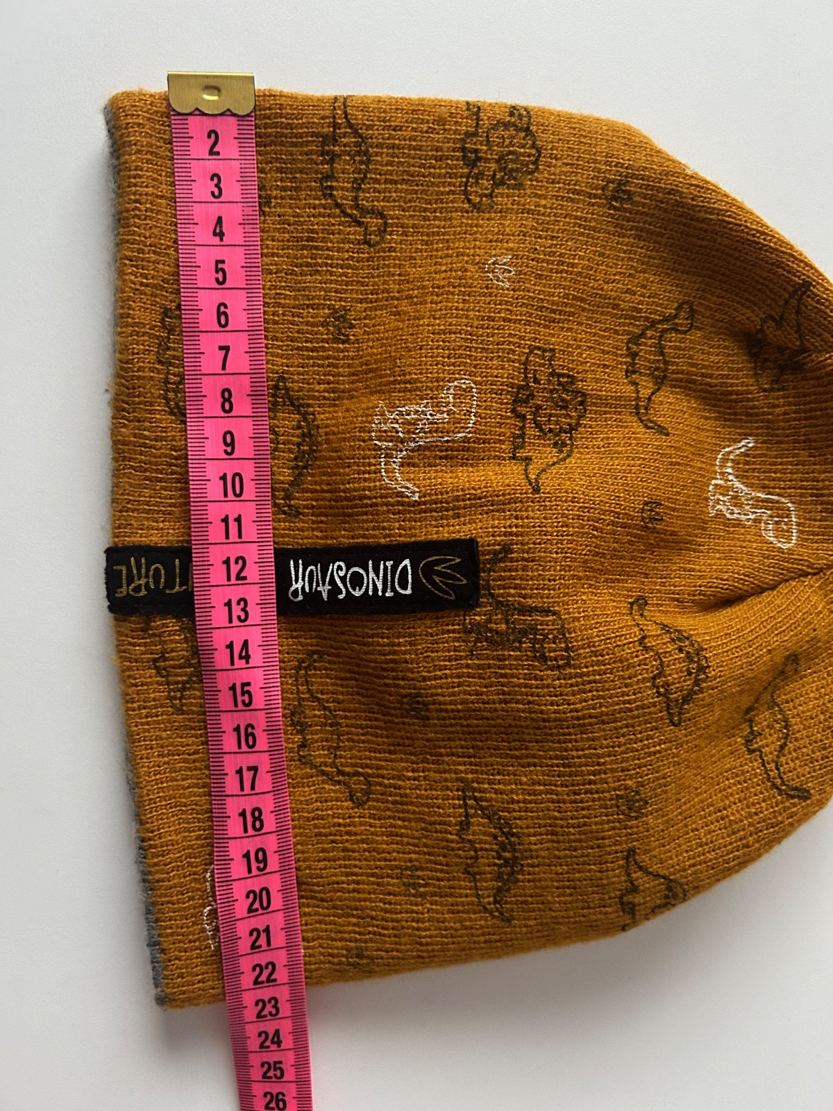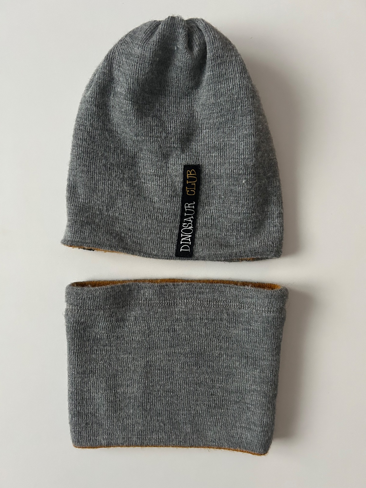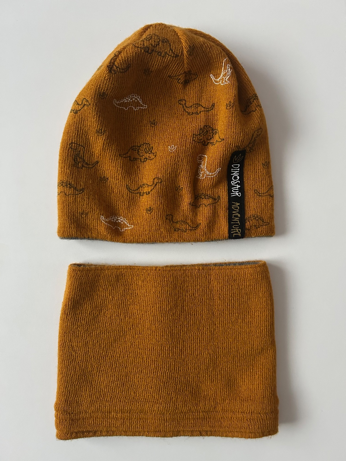 Jedna strana v neutrálnej sivej farbe s nápisom "DINOSAUR CLUB" a druhá strana v horčicovej farbe so vzorom dinosaurov.
