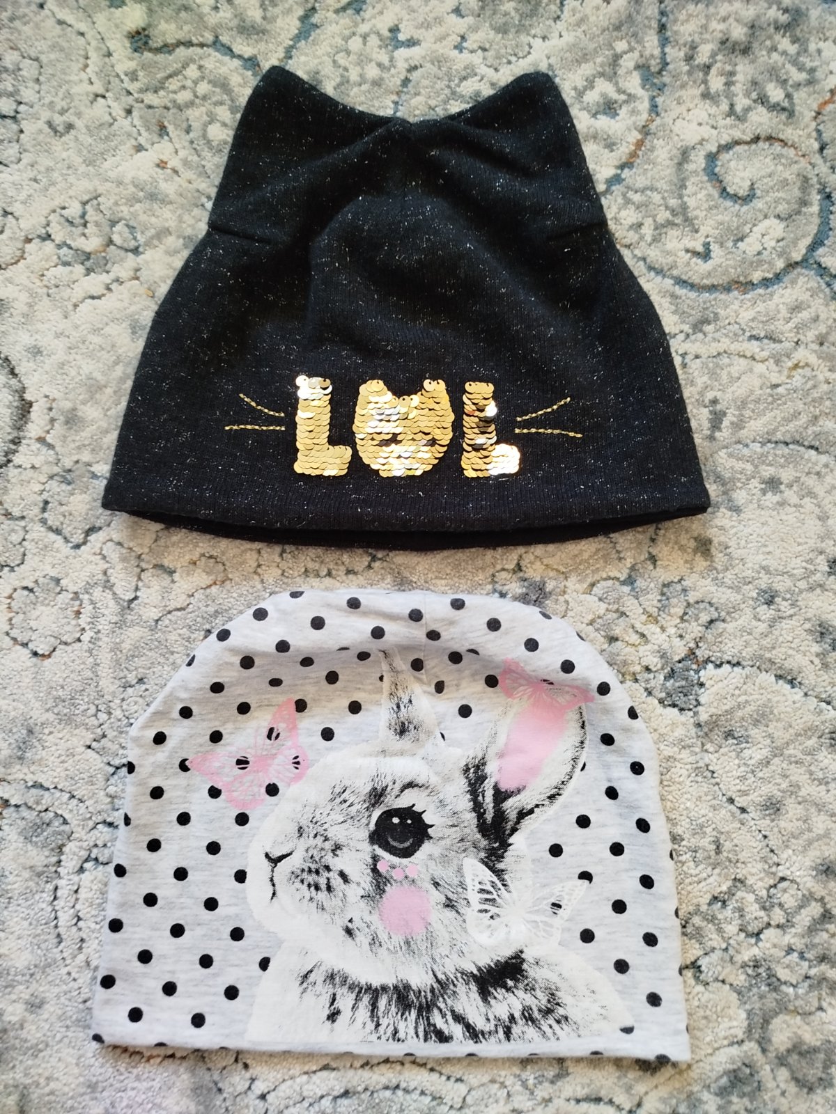 Krásne prechodné čiapky, pekný málo nosený stav. Obvod čiapky v kľude je 46cm. Dĺžka čiapky 19cm. Nápis LOL sa dá premieňať a obe sú dvojvrstové. Kus 3€ + pošta. Balné si neúčtujem 🙂