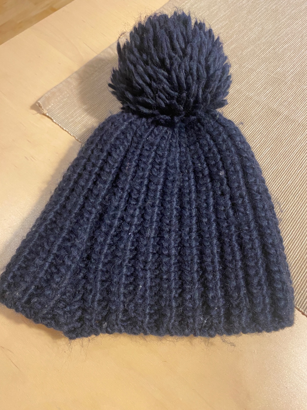Zimná detská čiapka s gongolcom značky POMPde LUX, tmavomodrá (navy), kožený detail, veľkosť 50cm, mäkkučká, príjemný materiál, nosená málo, nezničená.