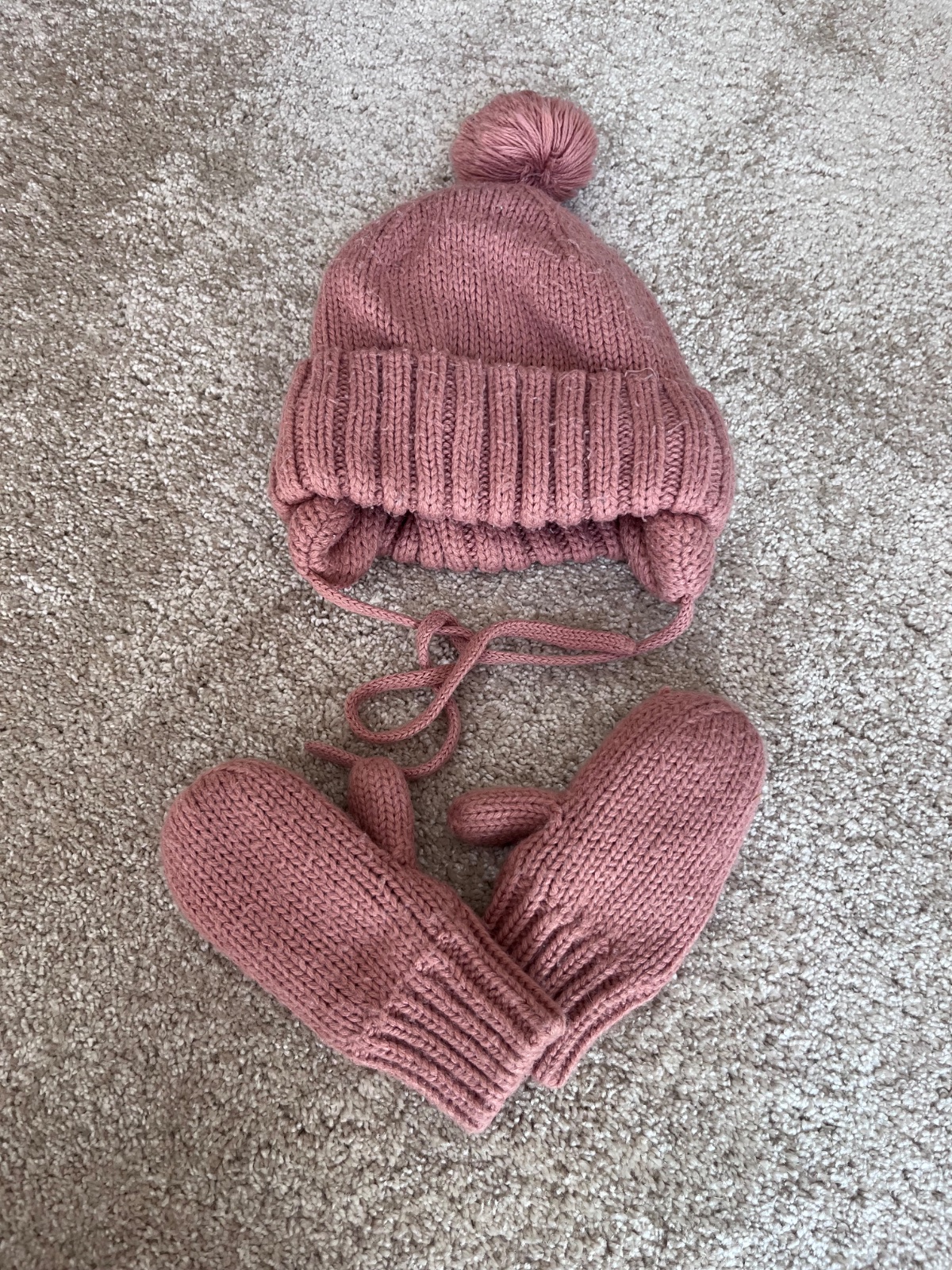 Rozkošná ružová čiapočka s pekným pleteným vzorom a mašličkou, podšitá tričkovinou, spolu s rukavičkami. Veľkosť 86/92