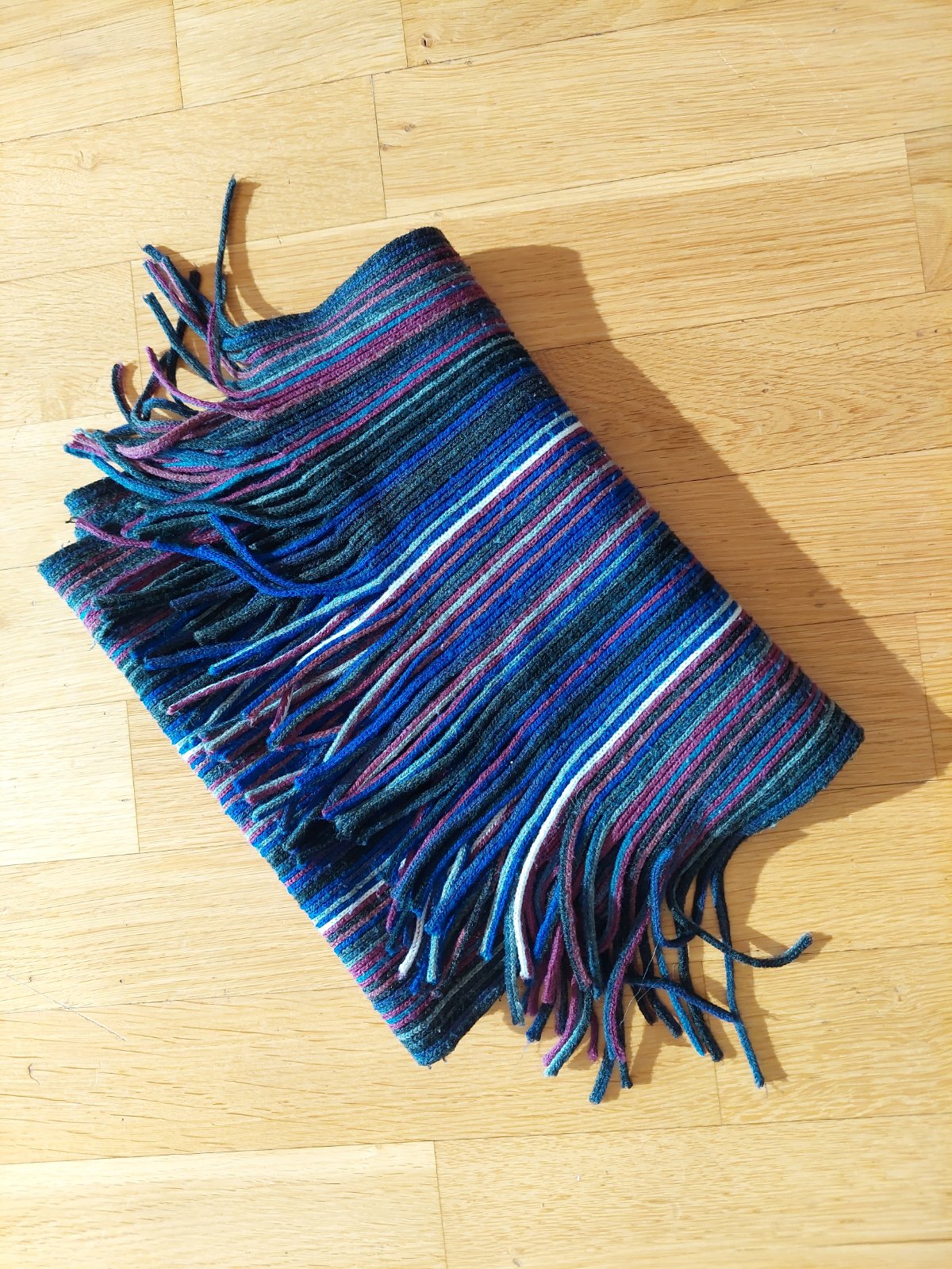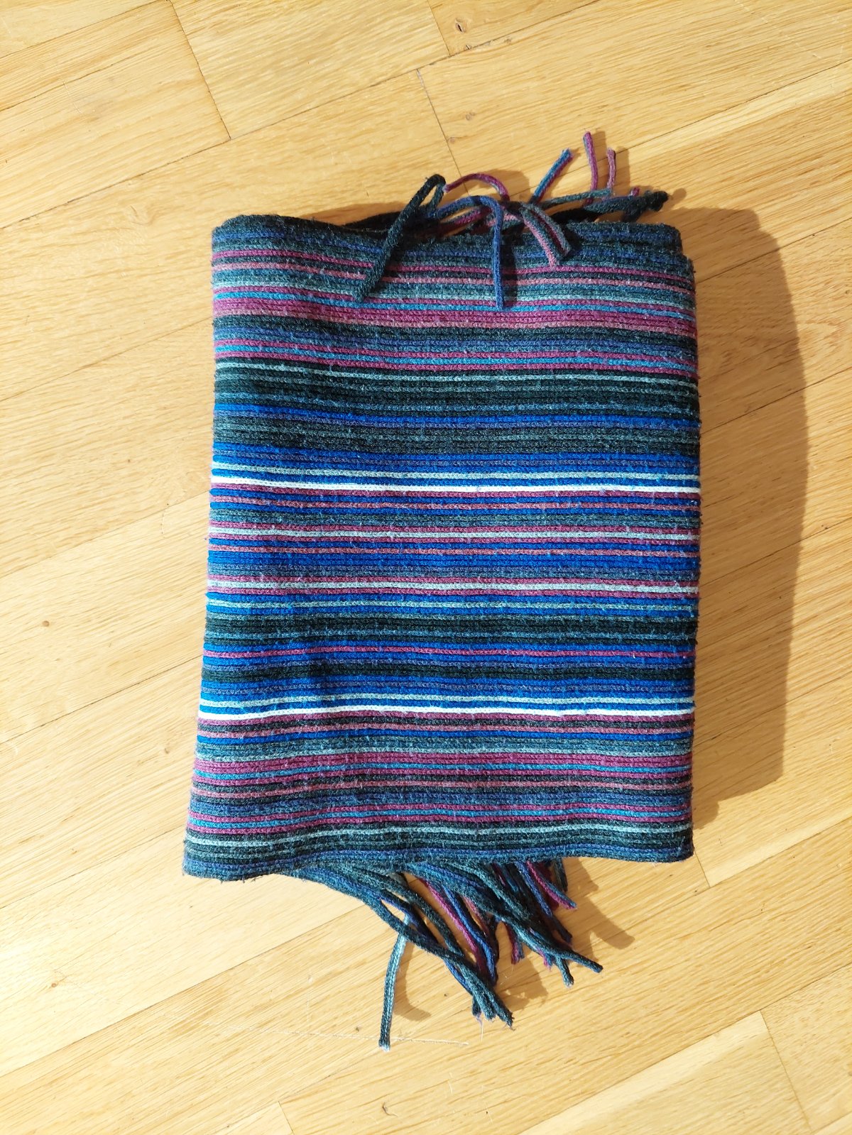 Nenosený vlnený hrubší šál, podšitý flísovou vrstvou, dĺžka aj so strapcami je cca 2 metre, šírka cca 15 cm.