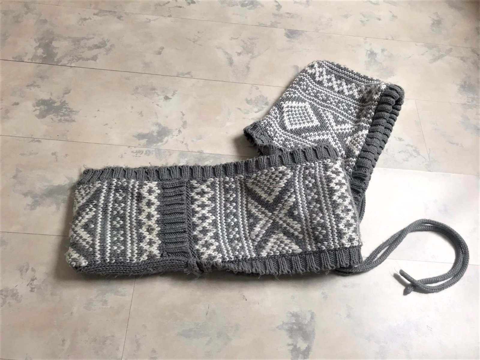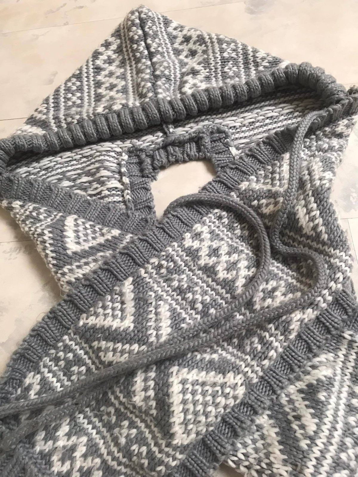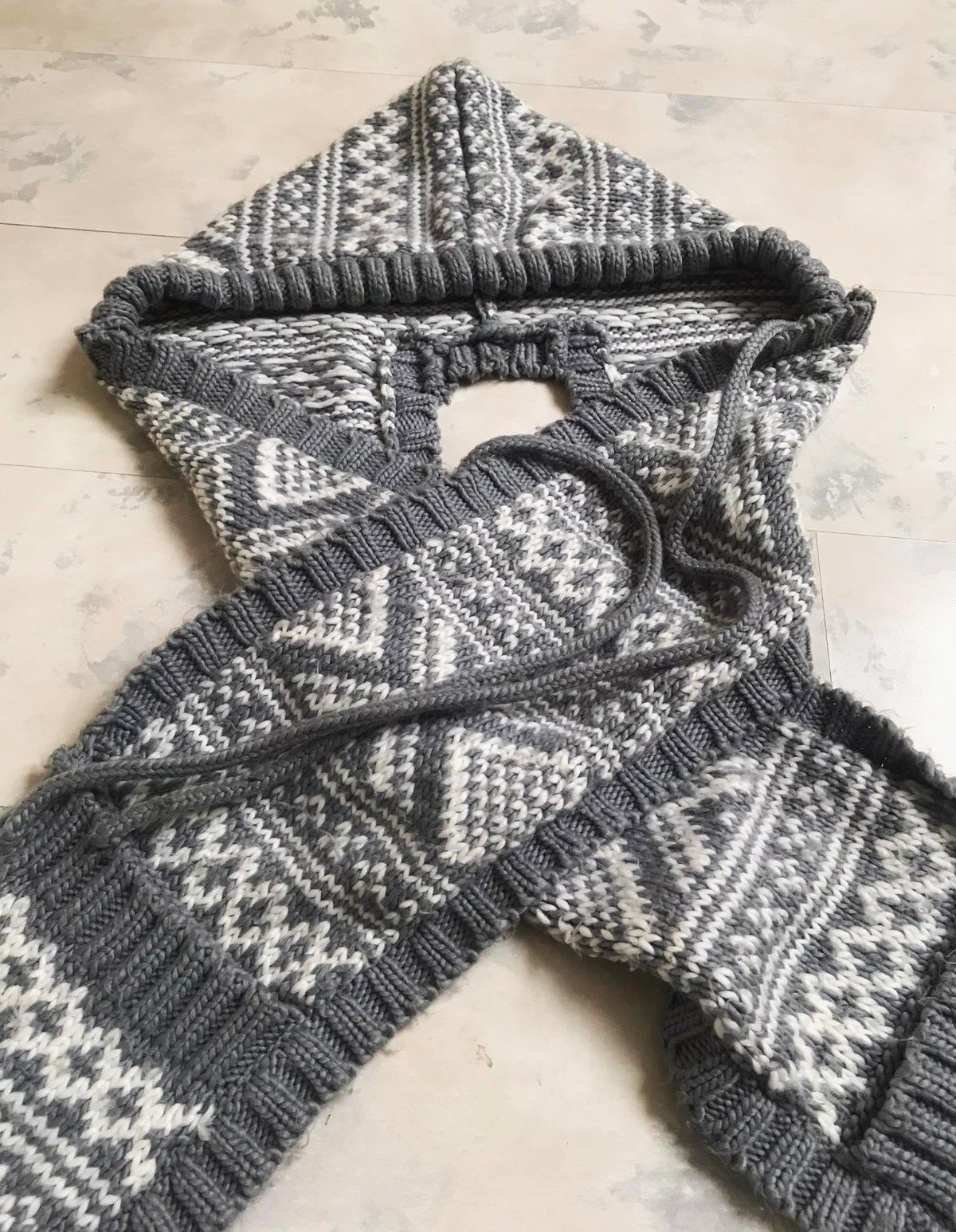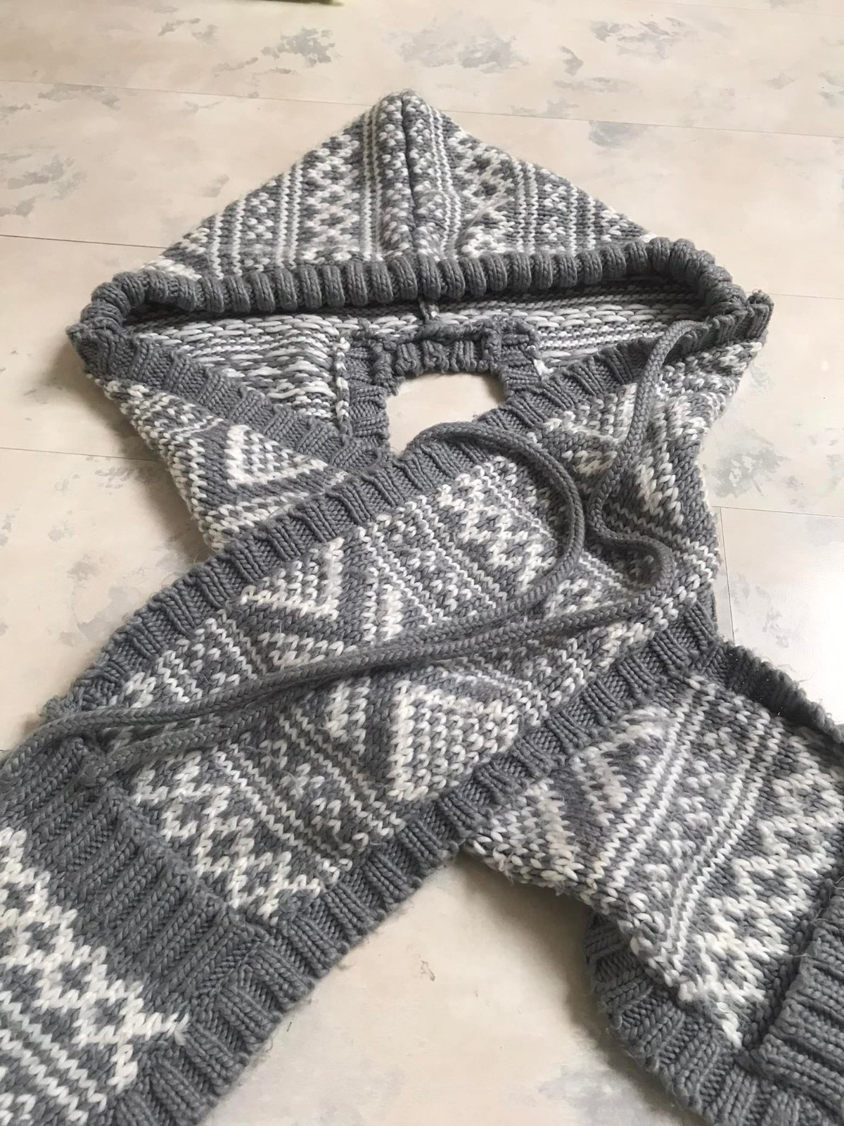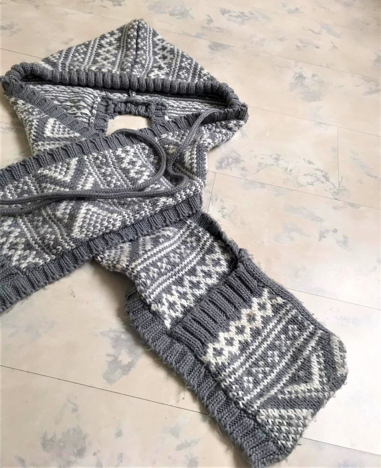 teplý,variabilný zachovalý set - šál + čiapka ( kapucňa ) ,na konci šálu vrecká,keďže je acrylový,má žmolky ktoré sa dajú ľahko odstrániť,ale upozorňujem- nie je to nič hrozné,dá sa obtočiť okolo krku a kapucňa sa iba naaranžuje a volne visí vzadu= veľmi efektne to vyzerá,ale aj veľmi praktické = v prípade použitia kapucne,keďže je súčasťou šálu..