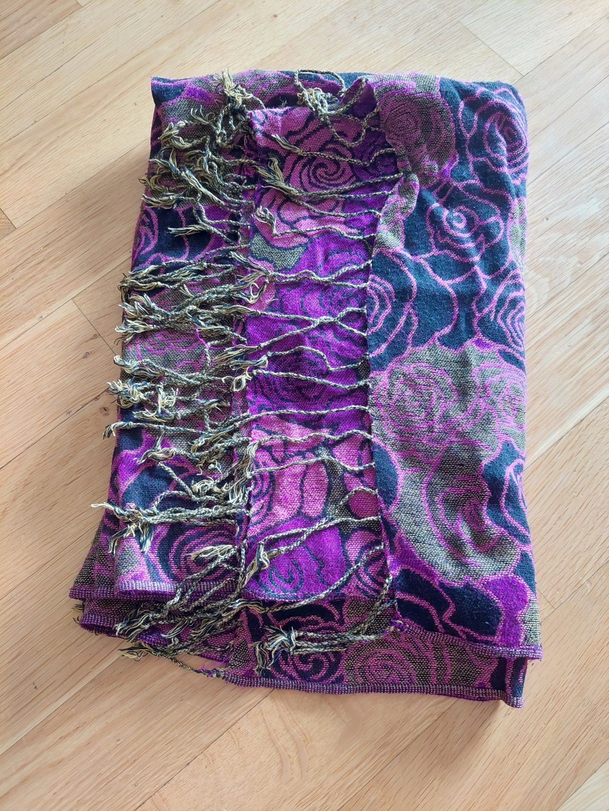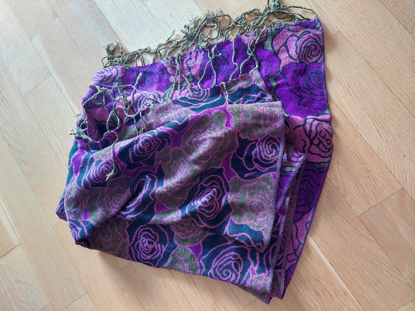 Krasny farebny (prevlada fialova farba) sal so strapcami, ktory Vas urcite zahreje. Dlzka 170cm. Š: 20cm.