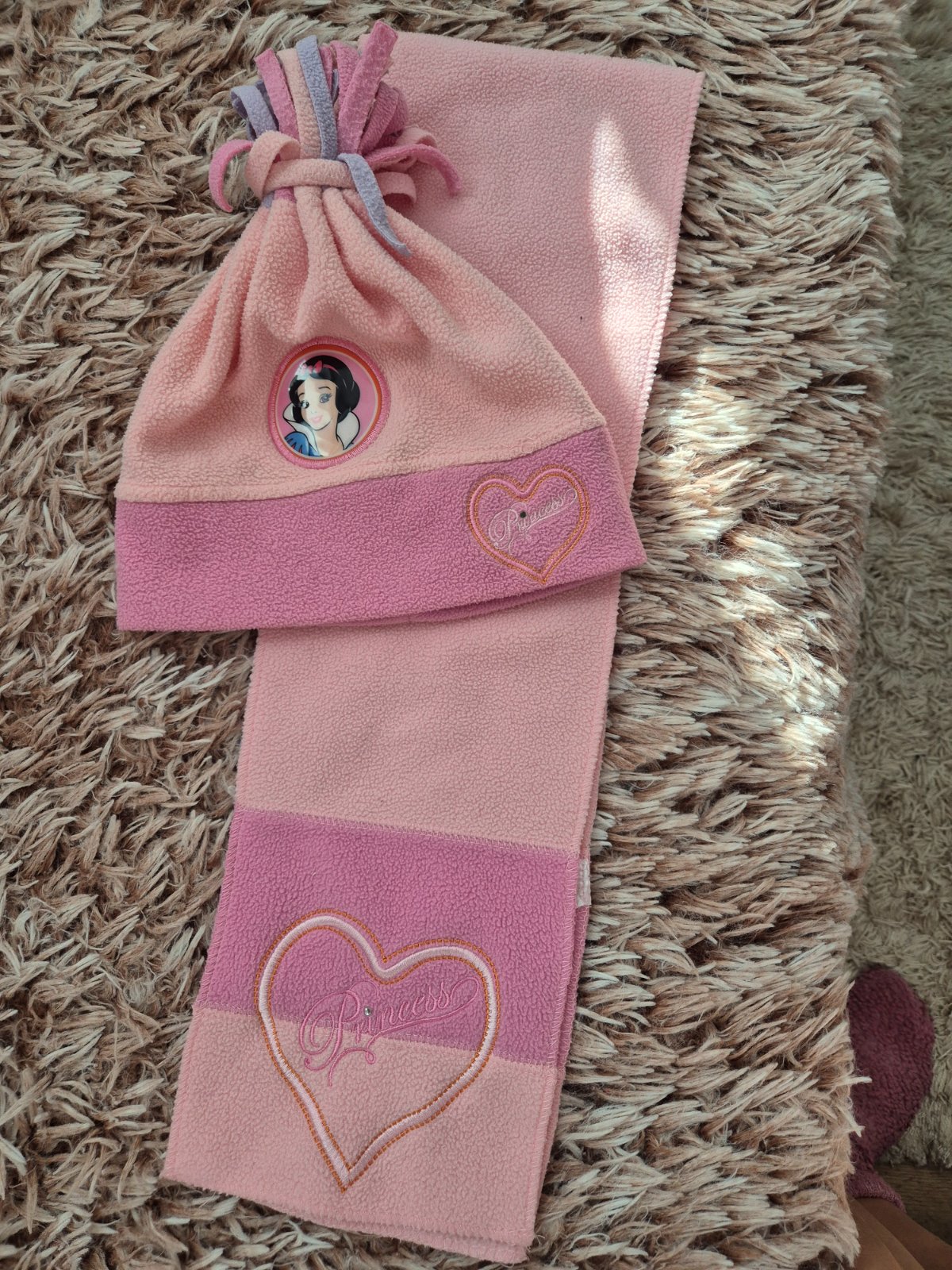 Predám čiapku so šálikom, málo nosené. Iba na čiapke v srdiečku odpadnuta trblietka,inak bez poškodení. Písaná veľkosť na 2-4 roky.