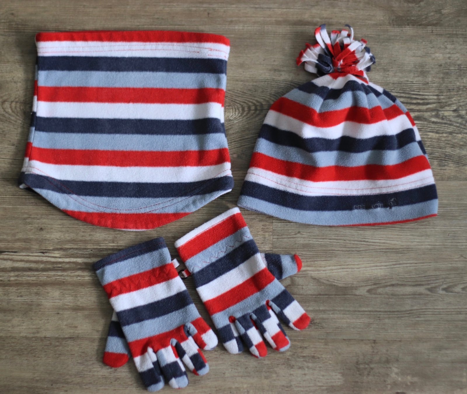 Flísový set čiapka, nákrčník a rukavice.. Veľkosť nie je uvedená, uvádzam odhadom, ako nám sedelo - na cca 2-5r... Čiapka s nákrčníkom sú bez poškodenia. Na rukavičkách viac vidno nosenie, gumičky okolo zápästí už povolili a sadnú do cca 4r.