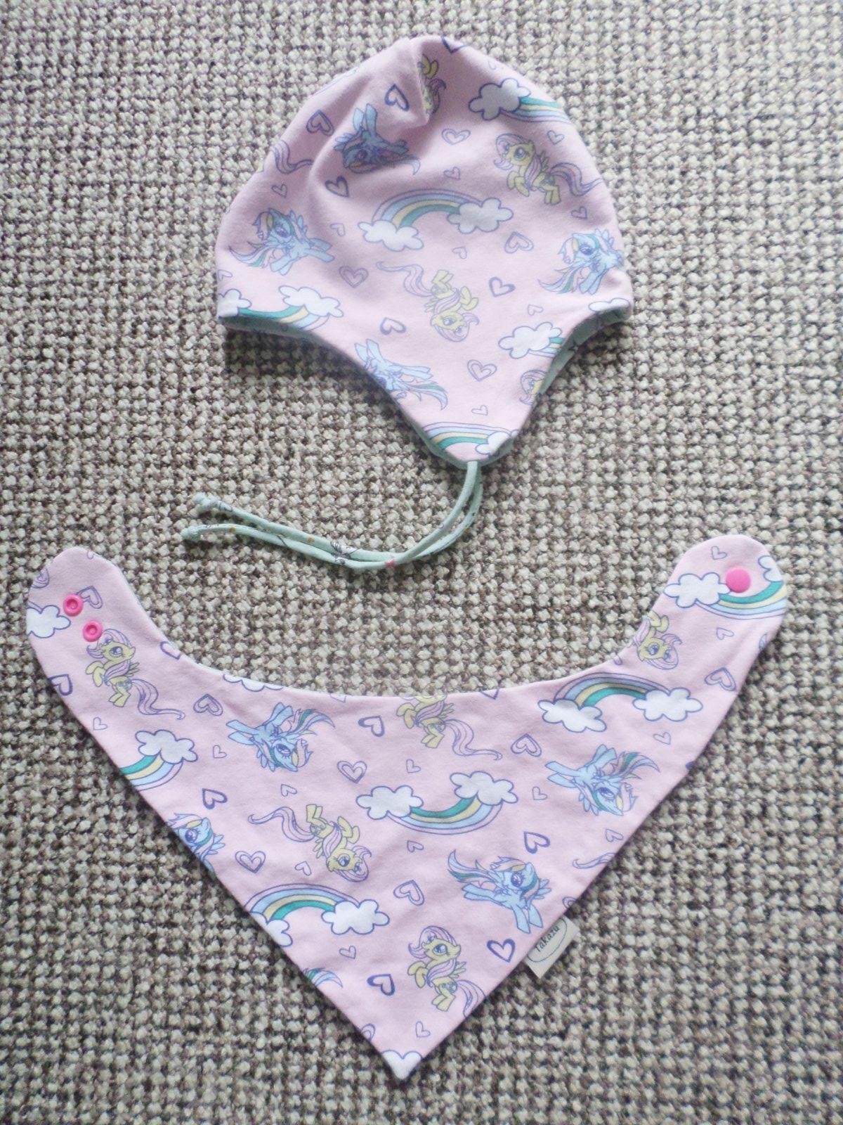 1x oblečený prechodný handmade set ušianka+nákrčník, z jednej strany mentolová zelená jednorožec, druhá strana svetloružová pony, šírka čiapky 22cm v kľude, výška o vrchu po spodok uší 23cm, farby sú pekné pastelové, na fotke trochu osvetlené