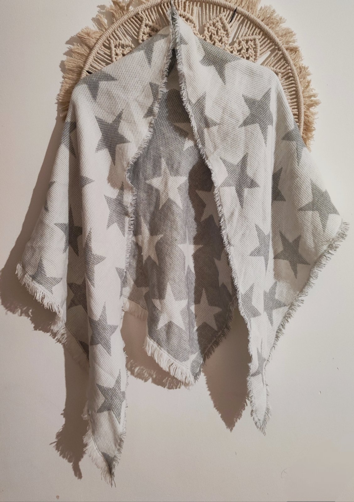 Šatka nebola nosená. Aj napriek tomu má malé poškodenia, ktoré sú odfotené na fotkách. Zloženie: 65% vlna, 35% polyester.