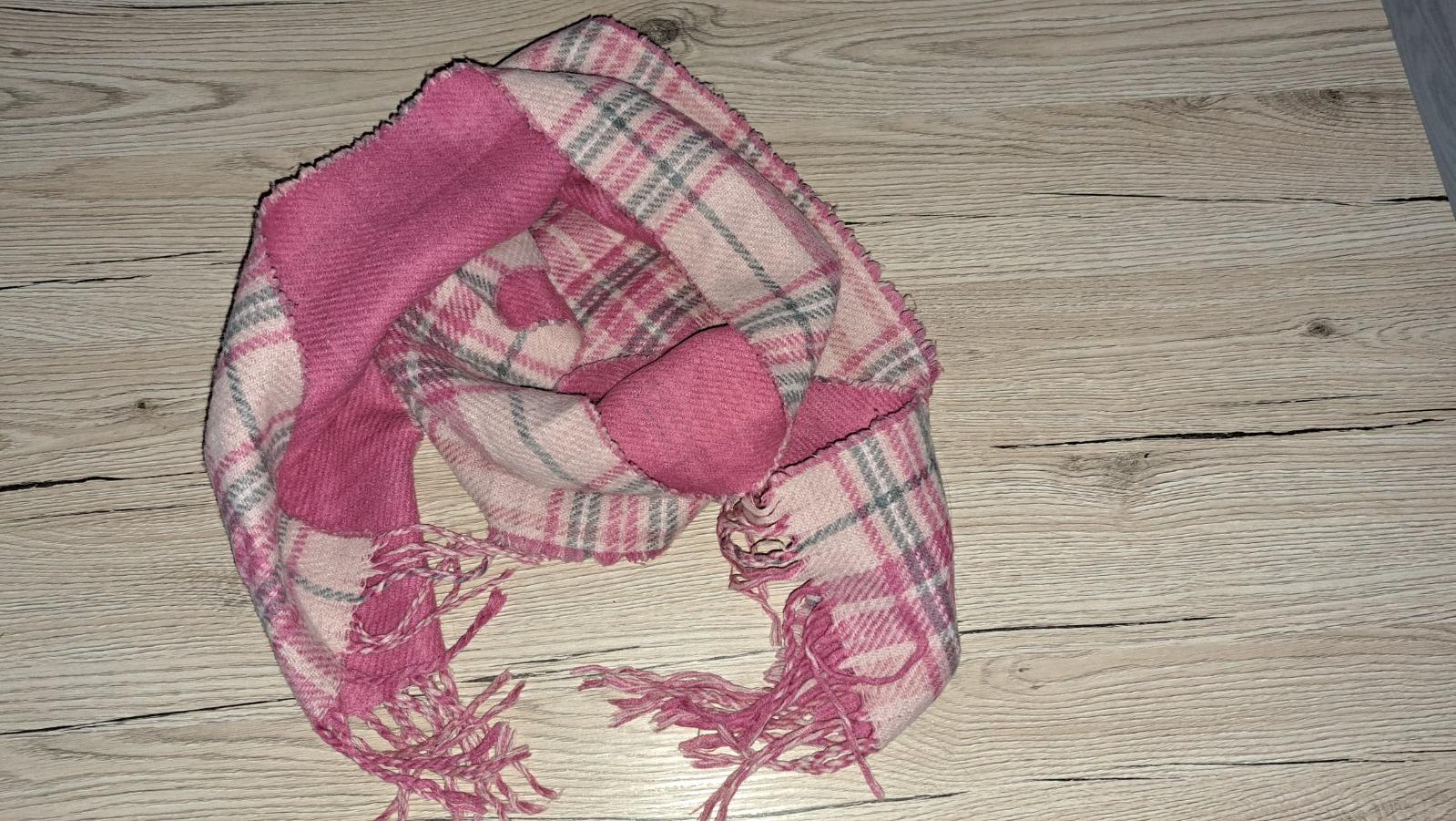 Dvojfarebný vlnený šál. Z jednej strany svetloružový, z druhej tmavoružový.