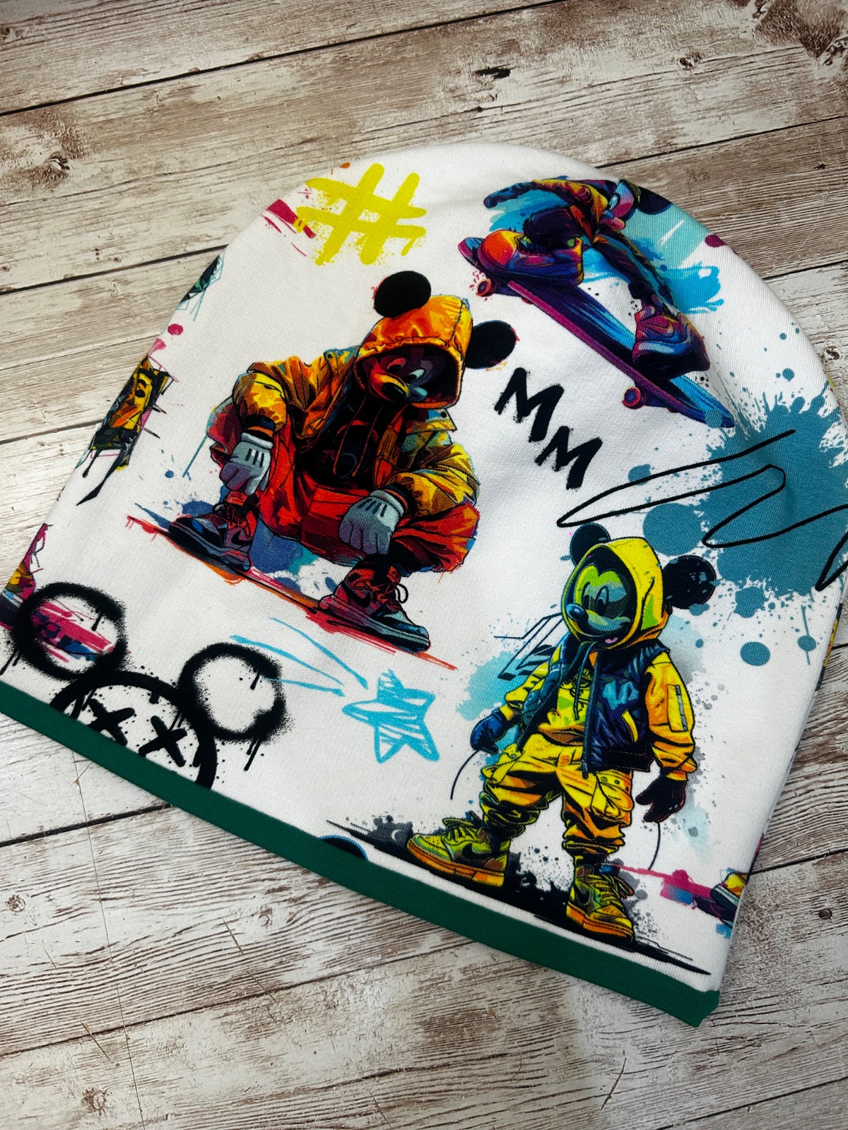 Štýlová detská čiapka s výraznou farebnou potlačou v street/graffiti štýle.