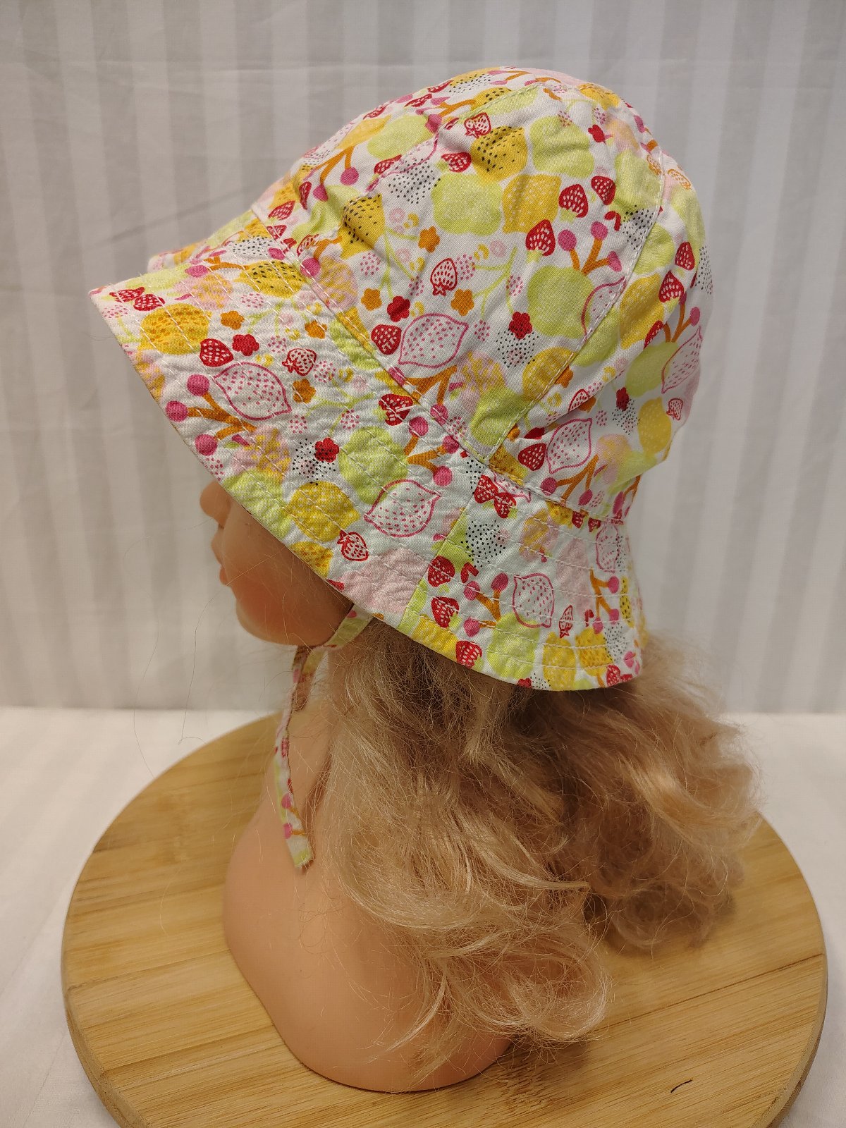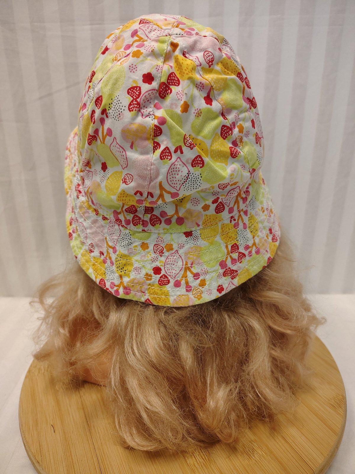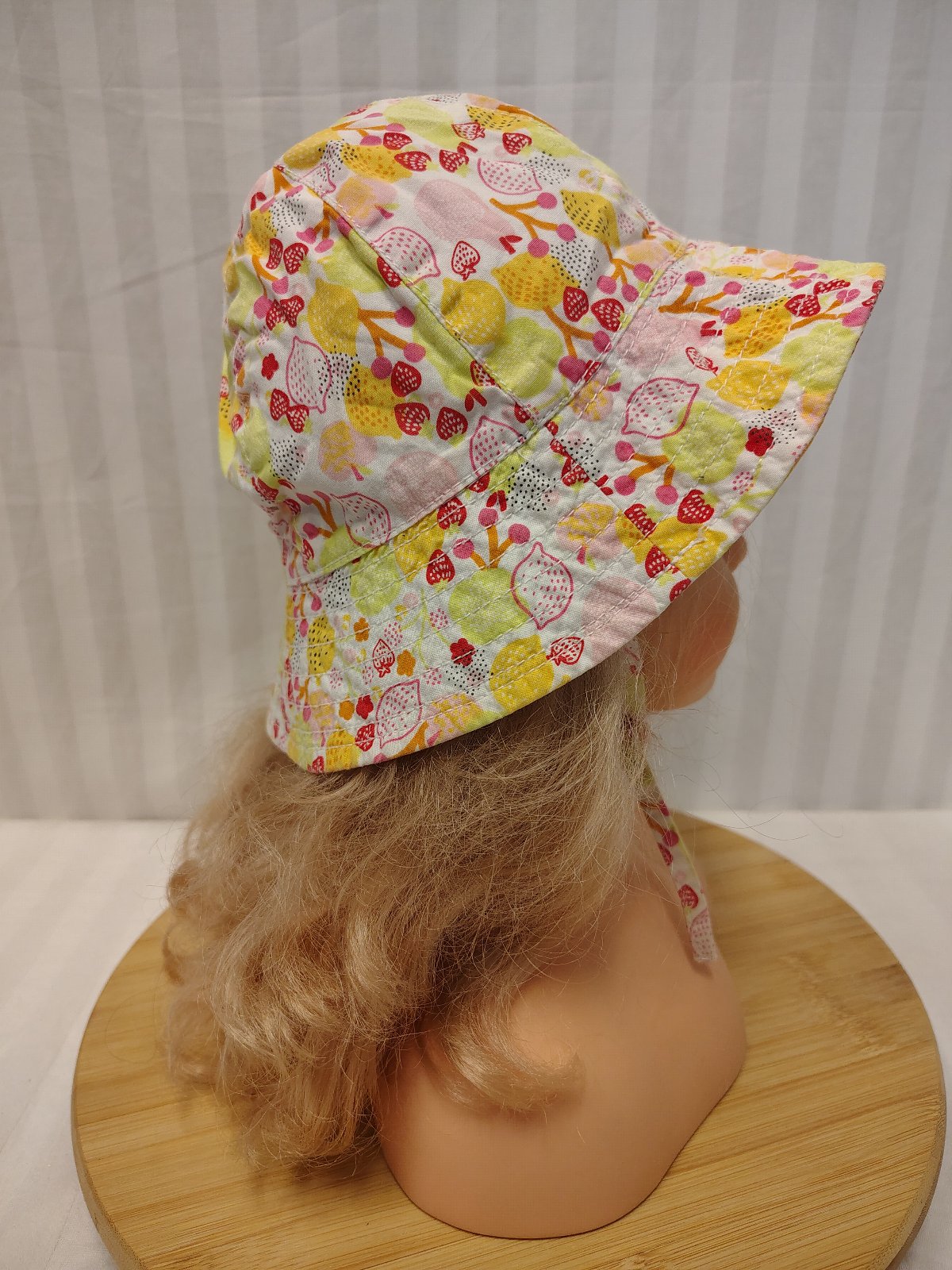 Dievčenský klobúčik ovocie, H&M, č. 3005, ide o dievčenský plátenný klobúčik značky H&M s veselým letným motívom citrónov a jahôd. Klobúčik je vo vynikajúcom stave, takmer ako nový, bez vyblednutia či poškodení. Šnúrky na zaviazanie pod bradou (klobúk neodfúkne). Ideálny na pláž aj bežné nosenie počas horúcich letných dní.
