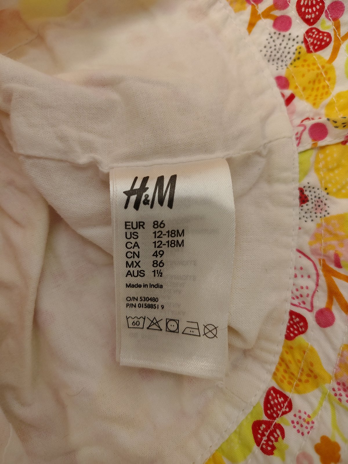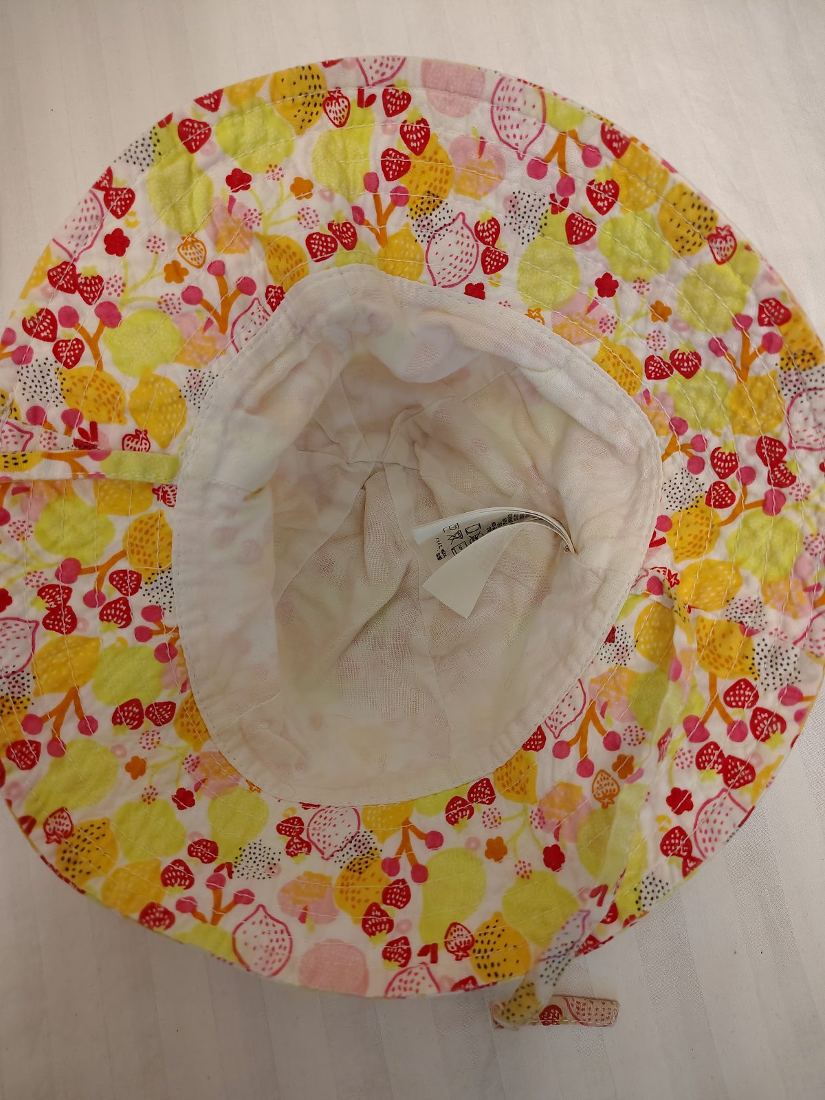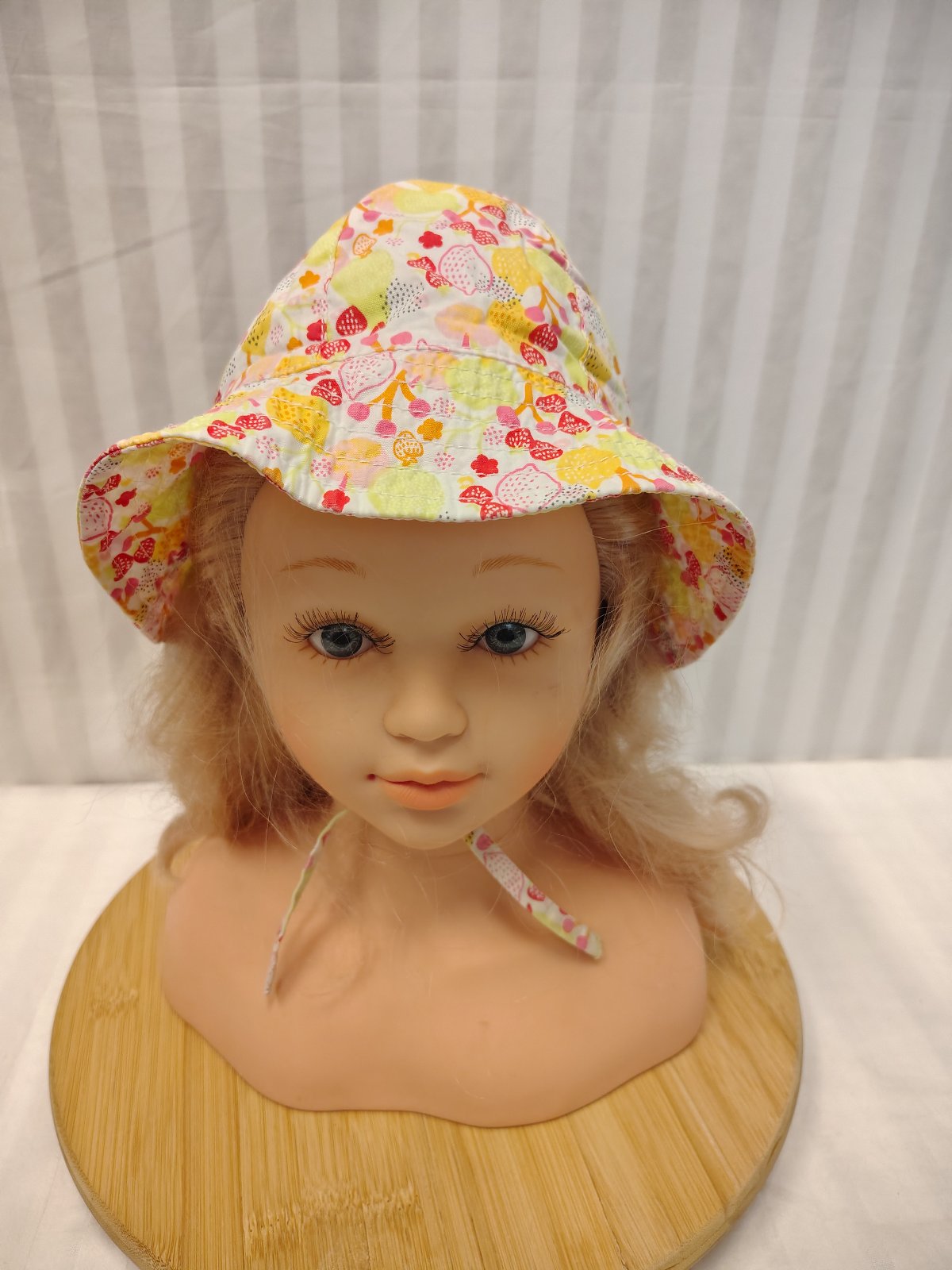 Dievčenský klobúčik ovocie, H&M, č. 3005, ide o dievčenský plátenný klobúčik značky H&M s veselým letným motívom citrónov a jahôd. Klobúčik je vo vynikajúcom stave, takmer ako nový, bez vyblednutia či poškodení. Šnúrky na zaviazanie pod bradou (klobúk neodfúkne). Ideálny na pláž aj bežné nosenie počas horúcich letných dní.