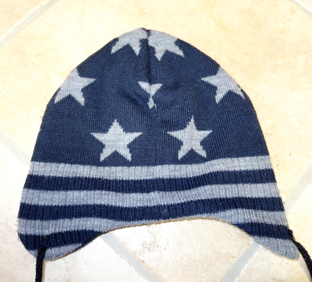 Vo veľmi dobrom stave bez poškodenia, len pár žmoliek. Prišila som si šnúrky, bola bez. Čiapka je zvonka pletenina, vnútri flís. Zodpovedá veľkosti. Vonkajšia šírka v kľude a v spodnej časti je cc 25 cm. Kryje aj uši.