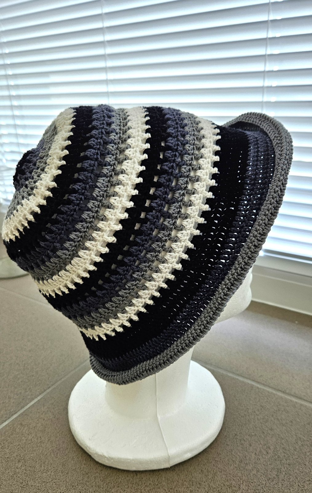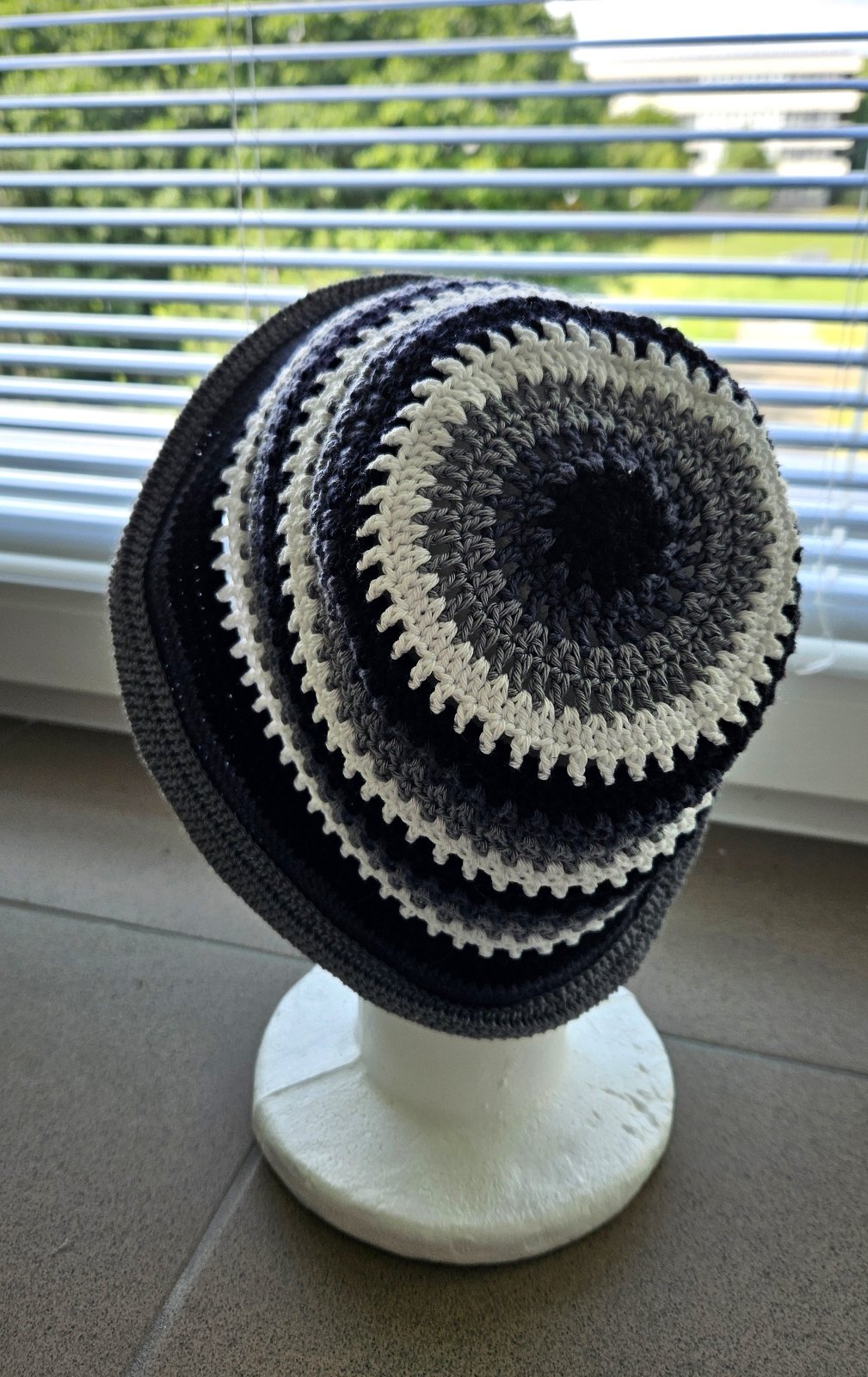 Klobúk na leto, handmade, modrý so šedými a bielym