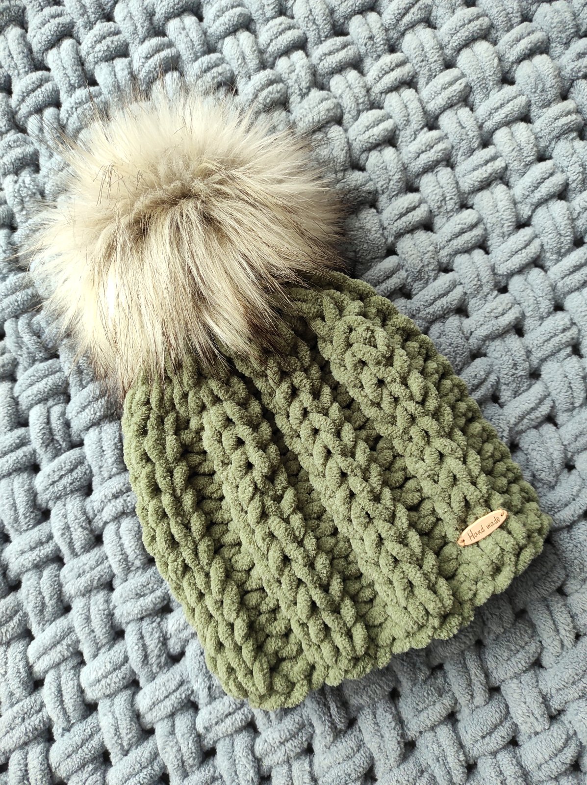 pletena ciapka z puffy s velkym jemnym brmbolcom. pre obvod hlavy cca 56cm