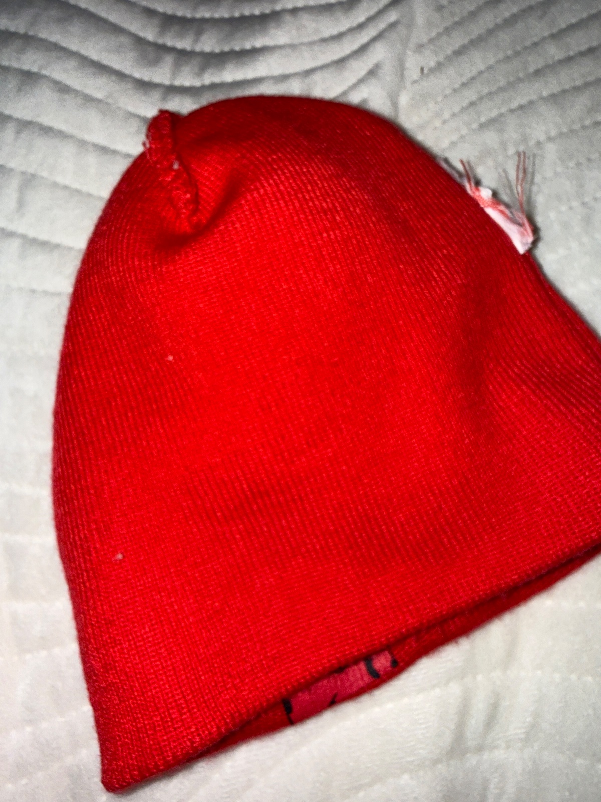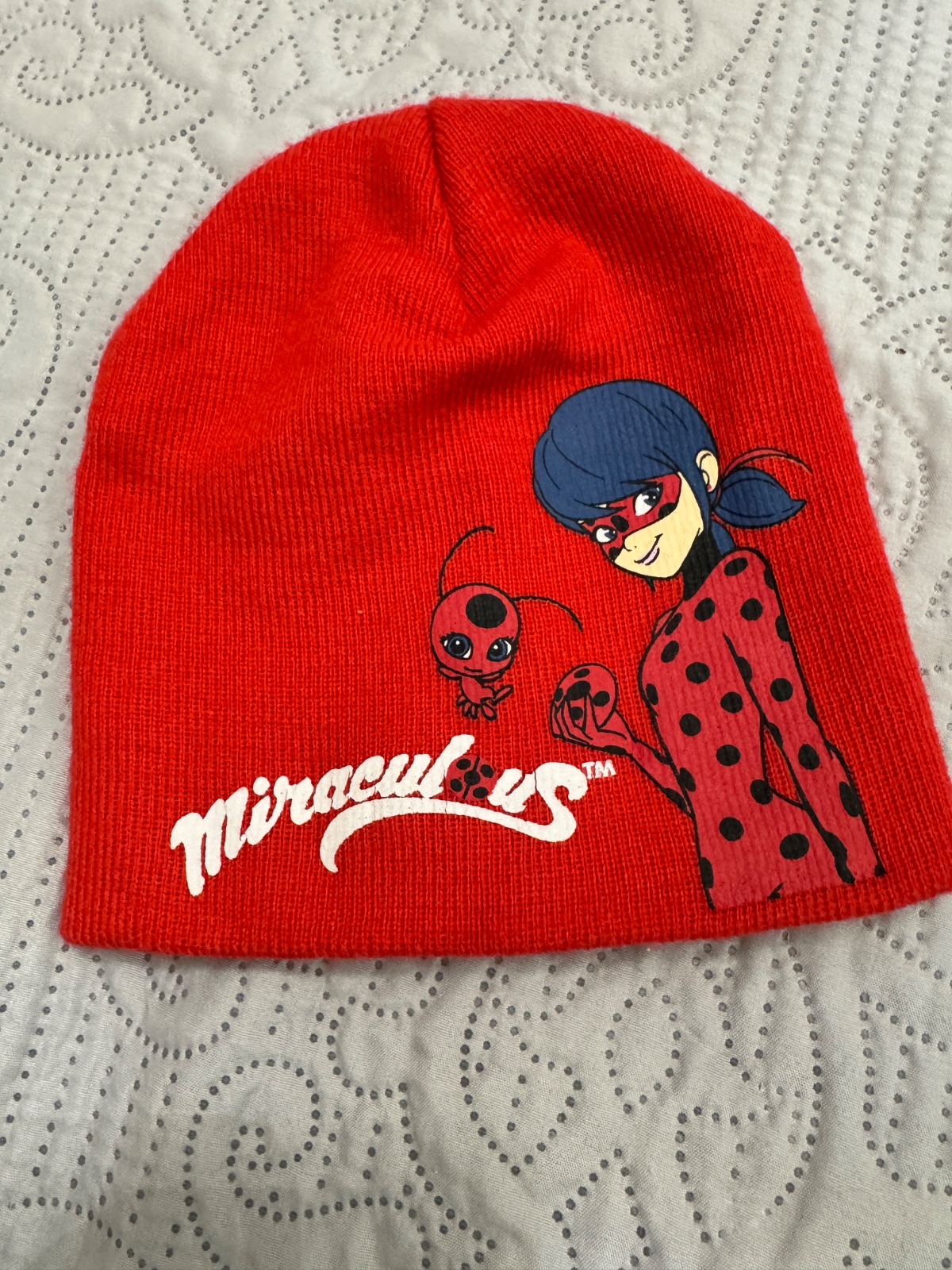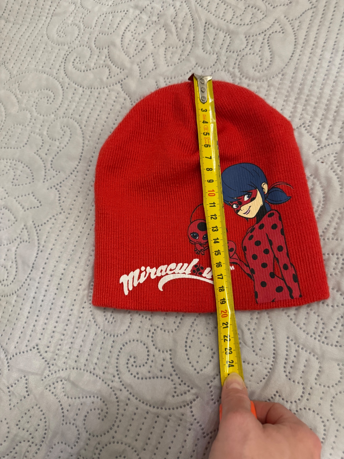 Krásna červená čiapka, možno aj neoblecena, odstrihnuty lístok, odhad veľkosti je do 8-9 rokov, pripadne pre mladšie dievčatko.
