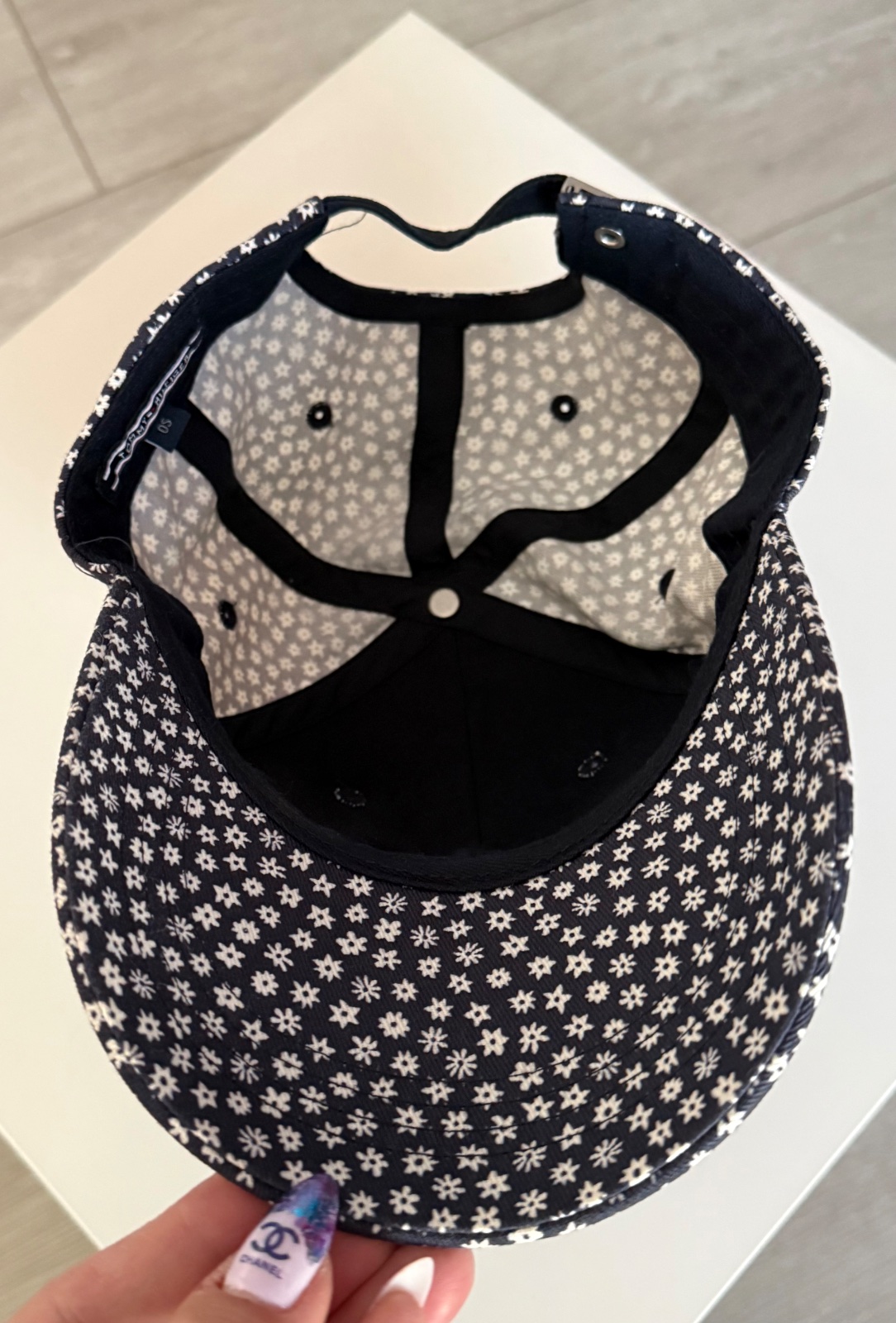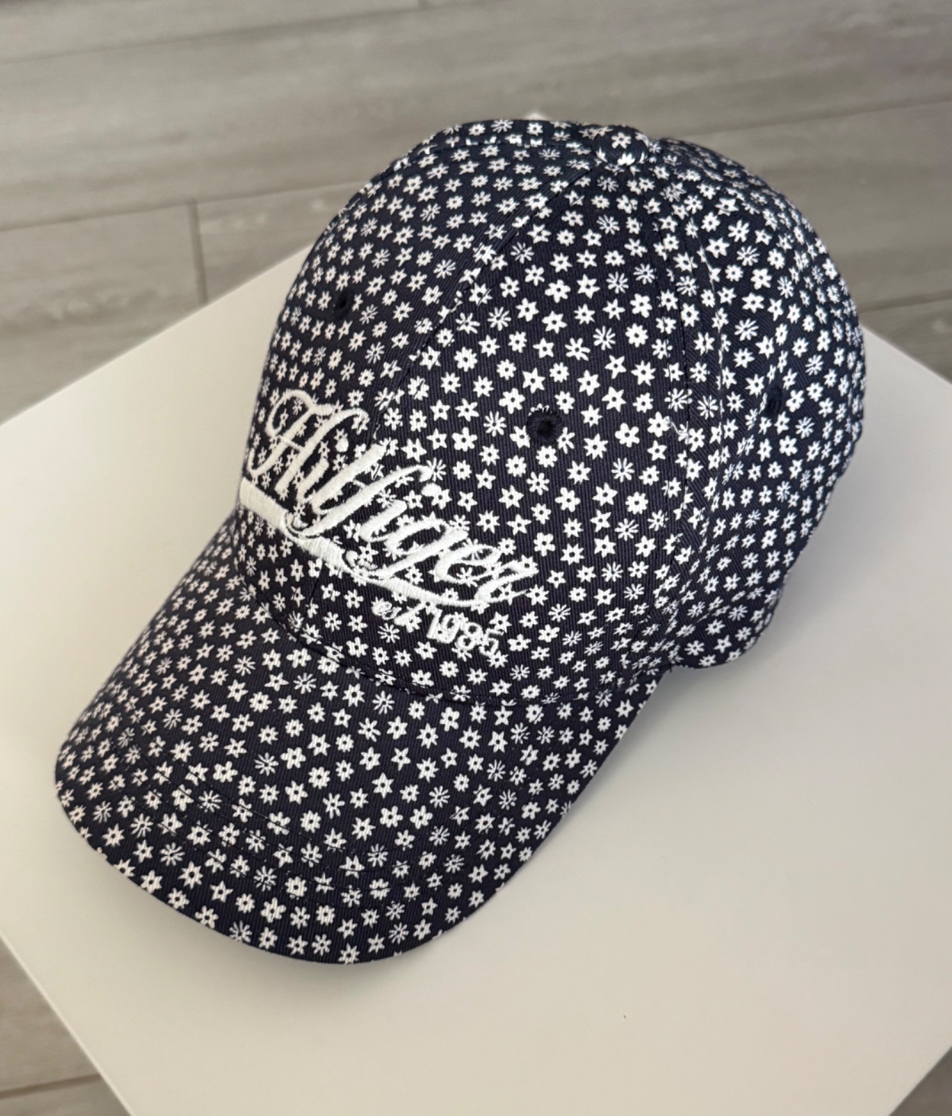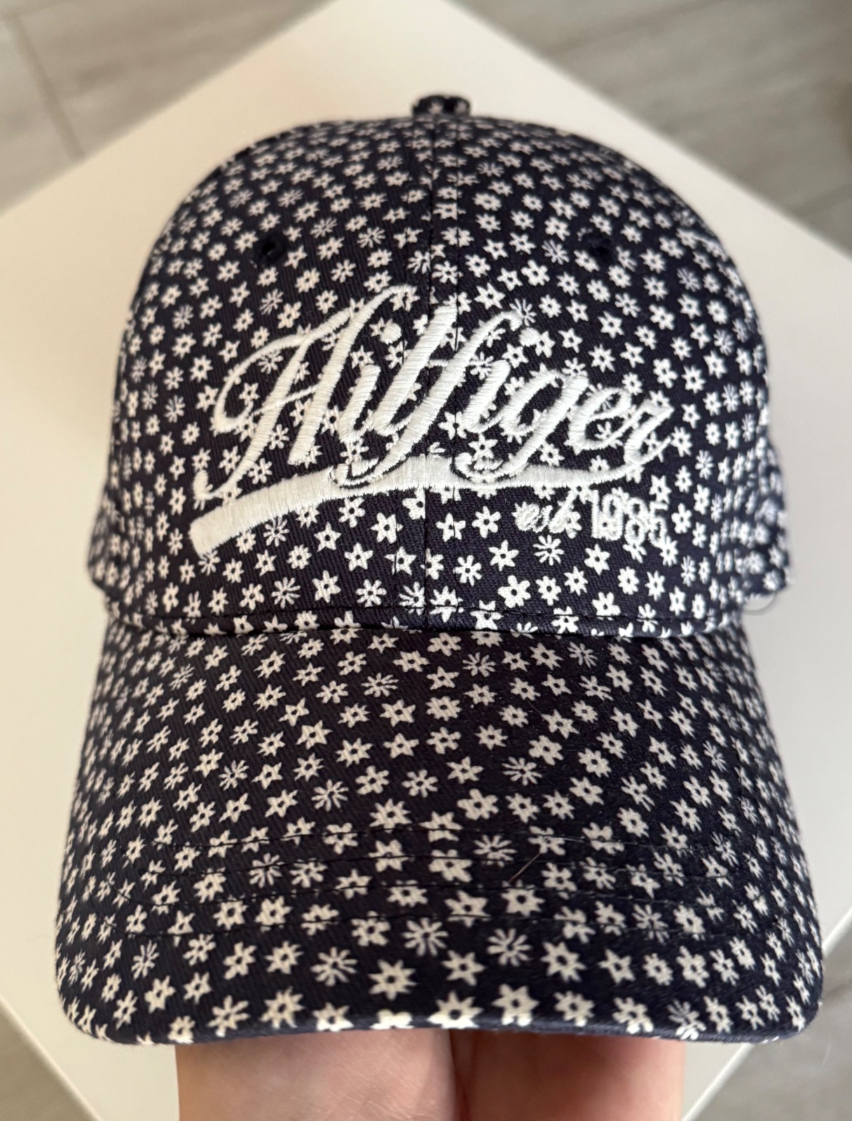 Krásna šiltovka TH. Tmavomodrá farba s bielymi kvietkami. Vpredu vyšité logo, vzadu nastavitelná. Velkosť UNI. Nová, nikdy nenosená.