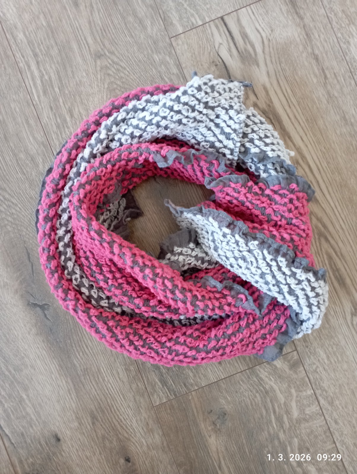 Mäkkučký hrejivý šál v krásnej farebnej kombinácii: ružová, sivá, biela.
