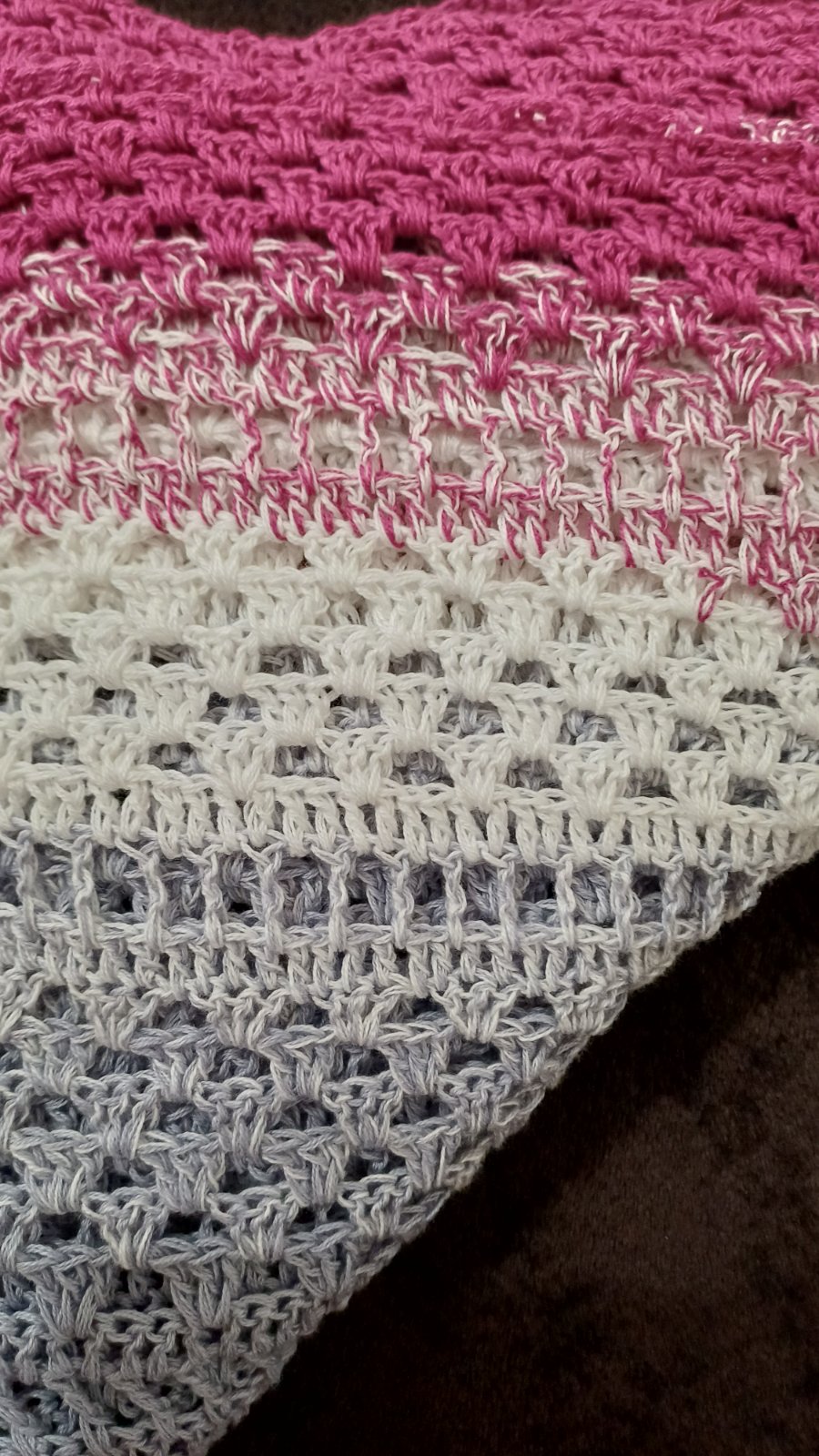 Háčkovaná ľahká trojuholníková šatka so vzdušným vzorom. 150 cm x 110 cm Vhodná na chladnejšie dni, príjemne zahreje. 100% Akryl. Pranie na 40 stupňov, sušiť voľne položené na osuške. Na objedn...