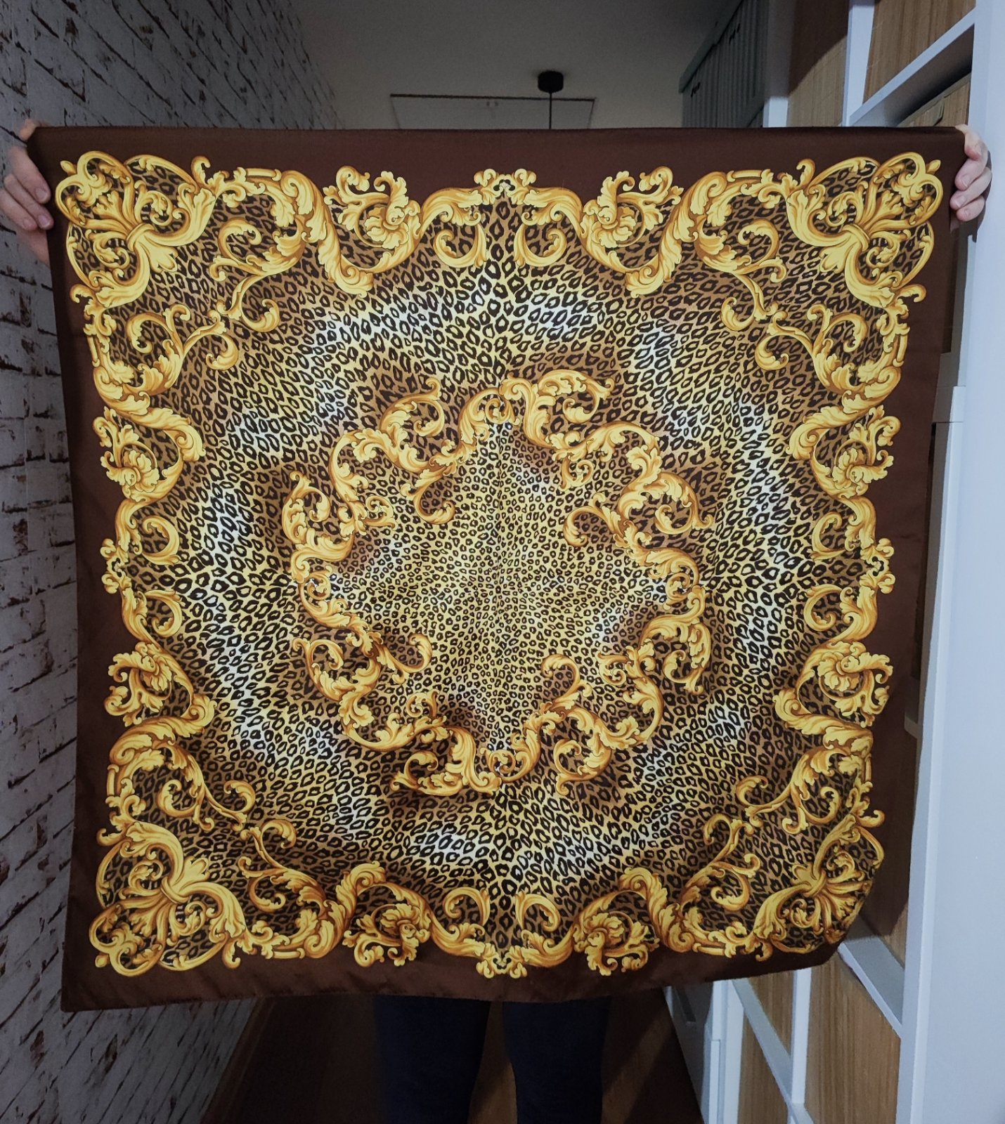 Príjemná mäkká veľká šatka, rozmery 140x140 cm. Zopár zatiahnutých nitiek.