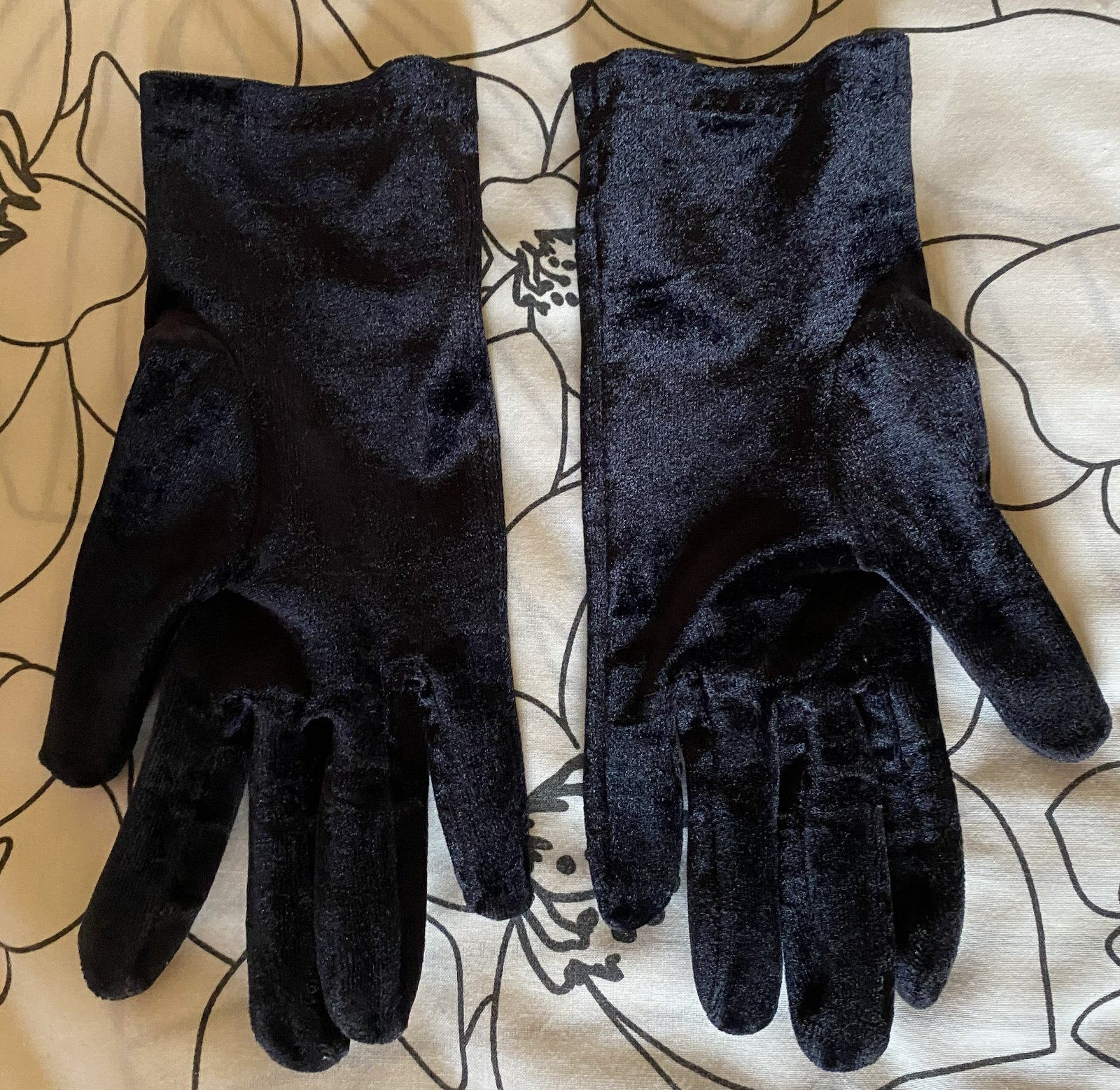 Elegantné čierne zamatové rukavice - UNI veľkosť, ra použité, v top stave. Miery: dĺžka od vrchu prostredníka hore: 23cm, šírka: 8,5cmx2, sú pružné, všade povolia.
