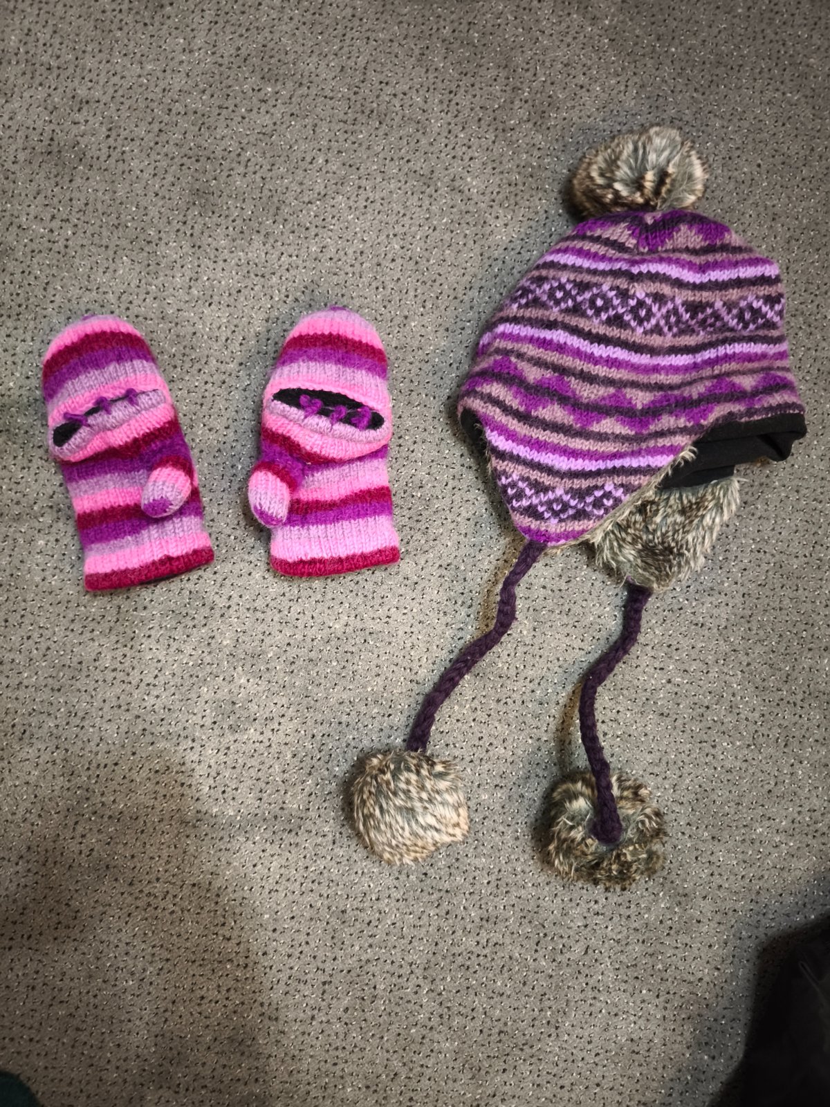 Rukavice a čiapka, hrubé, podšité flisom, etno štýl, kupované v etno obchode.