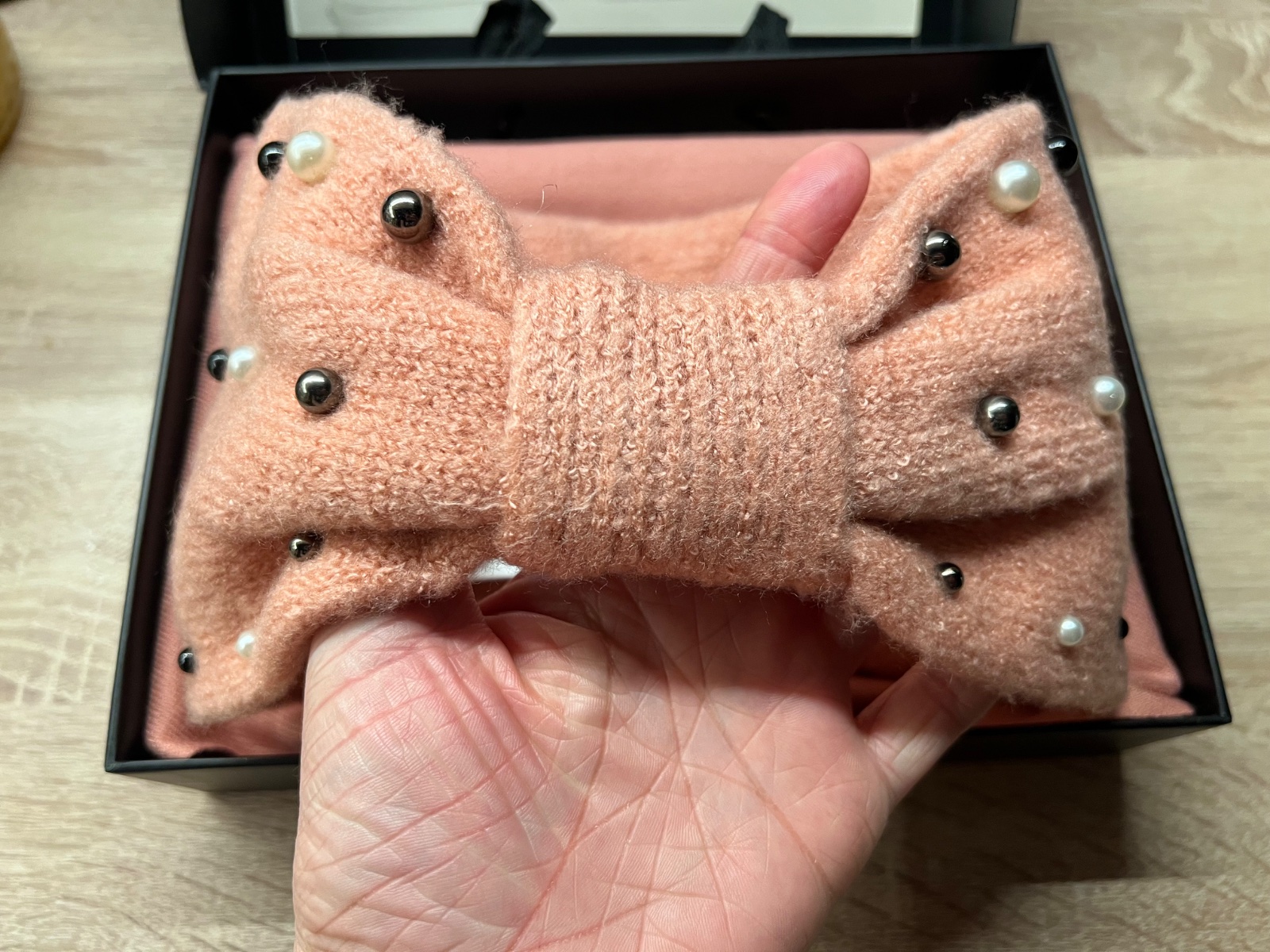 Nove, zabalene v darcekovej krabicke, bohuzial, pri stahovani sa krabicka troska roztrhla, krasna celenka zdobena koralikmi a v rovnakej farbe salik, celenka je taka teplejsia, sal tensi, oba vyrobky hebucke a jemne, krasna koralovoruzova/lososovafarba