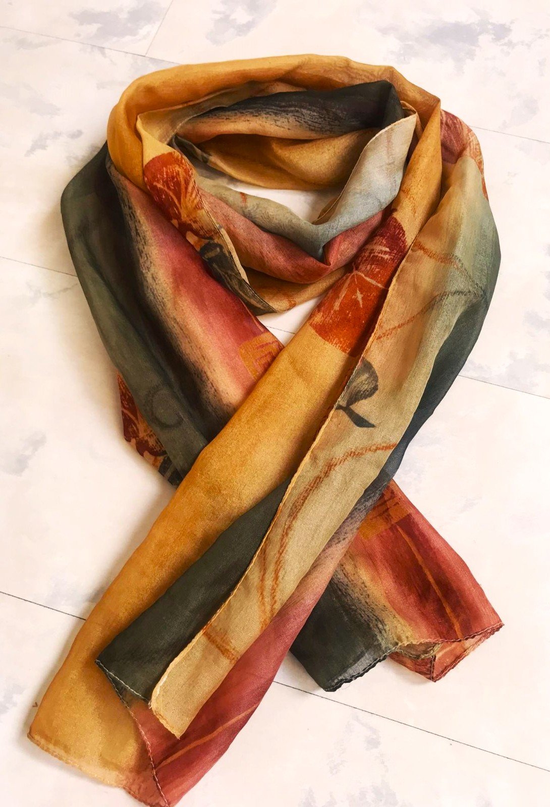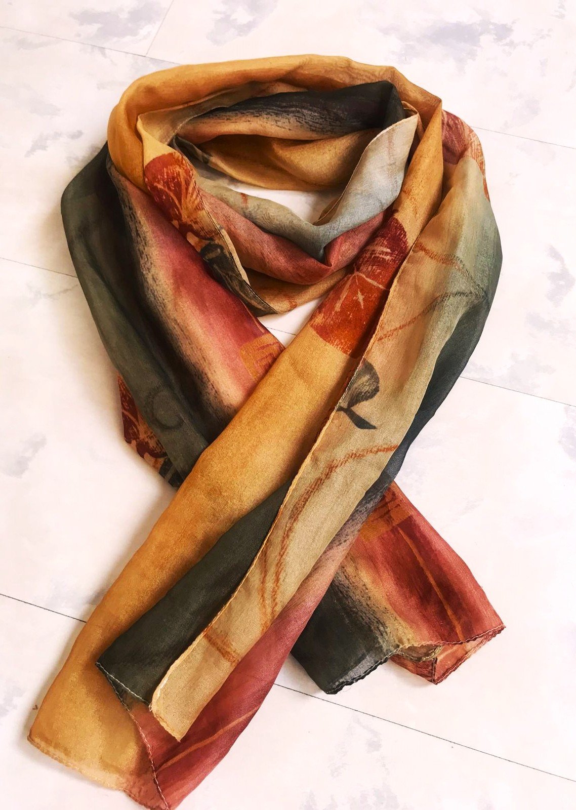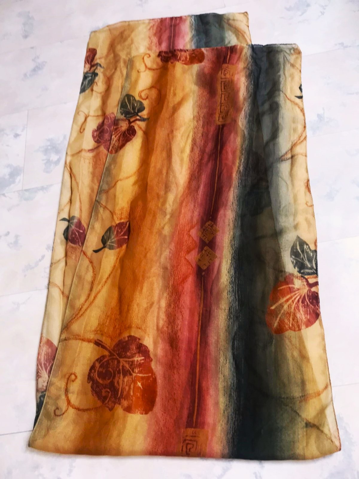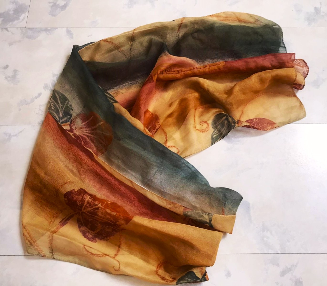 jemná šifónová dámska šatka v jesenných zemitých farbách,s motívom jesenných listov, mierne priesvitná,s rozmermi 152 x 35 cm,vyznačuje sa farebnou kombináciou hnedo-medenej a ďalších jesenných odtieňov