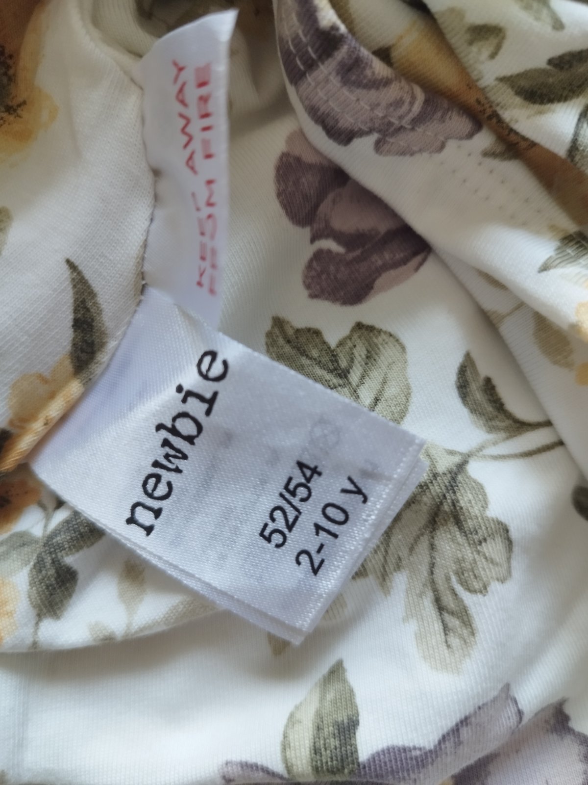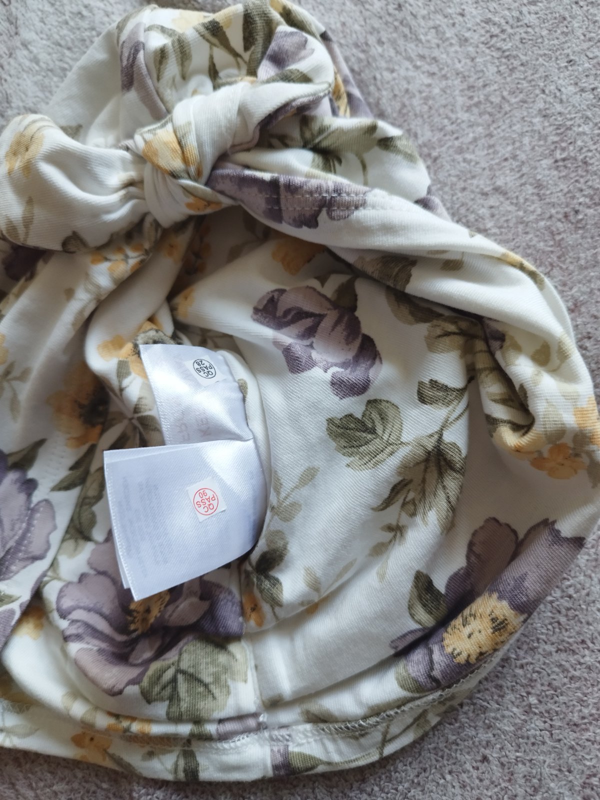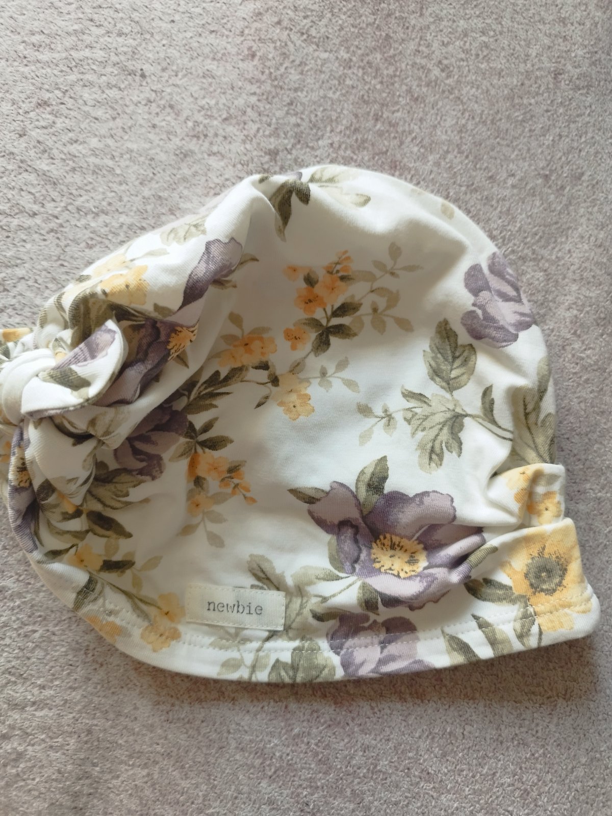 Nový ešte nepraný (len dole výsačka) tenký biely newbie turban /čiapka s fialovými a žltými kvetmi vo veľkosti 52/54 (2-10 rokov).