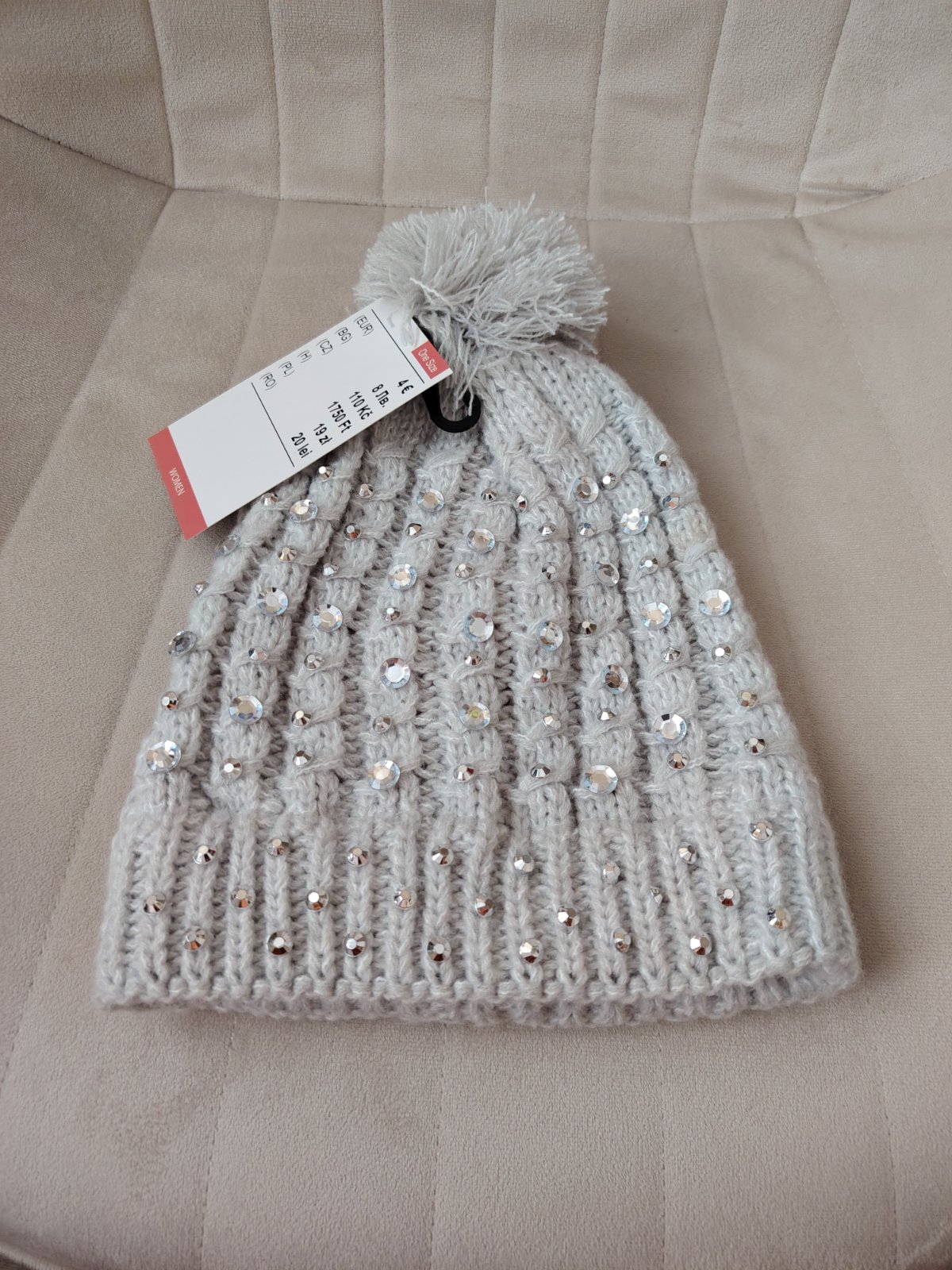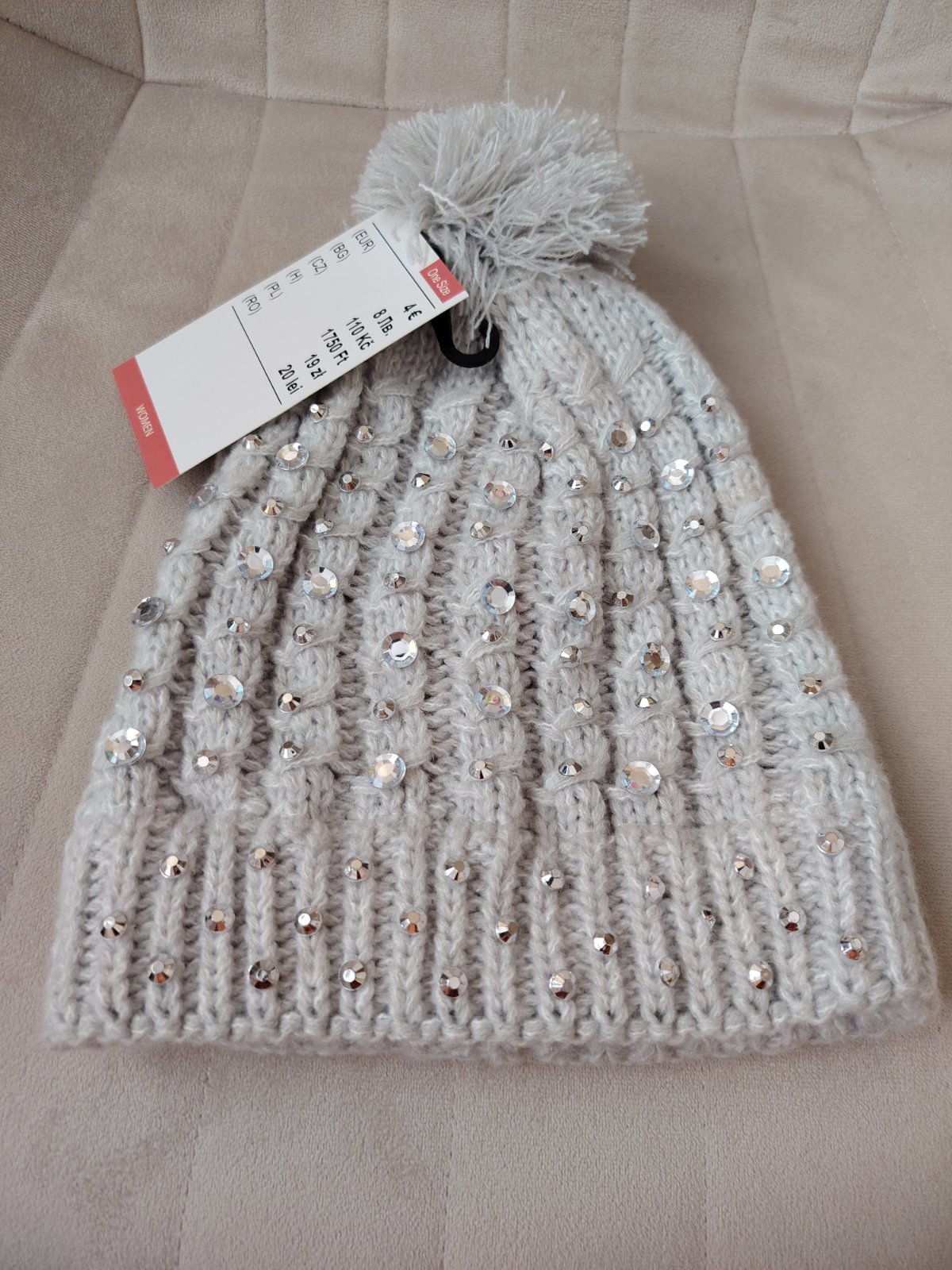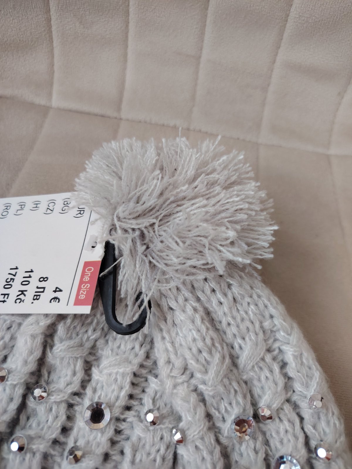 - nová sivá čiapka s brmbolcom a s ozdobným kamiekami, kupovaná v Kiku