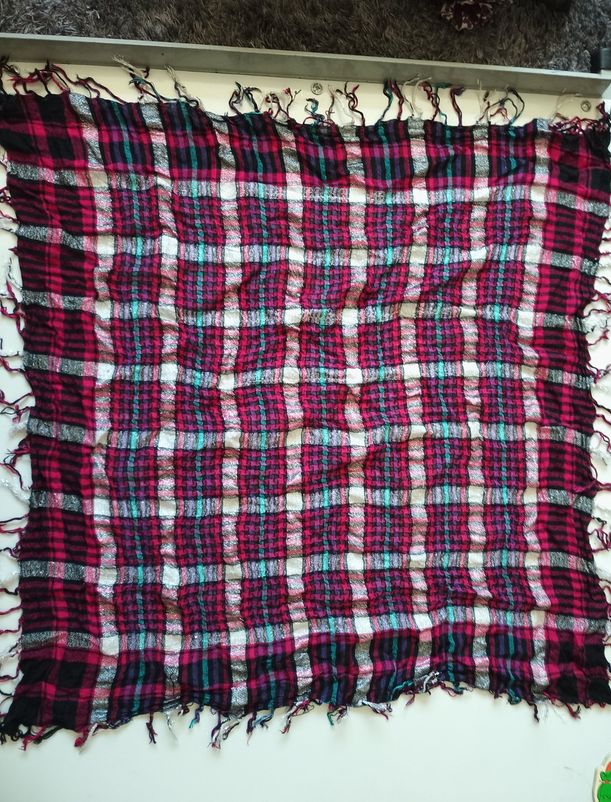 Cyklámenovo-čierno-strieborno-fialovo-tyrkysovo-bielo farebná. Výborný stav. 75×75cm.