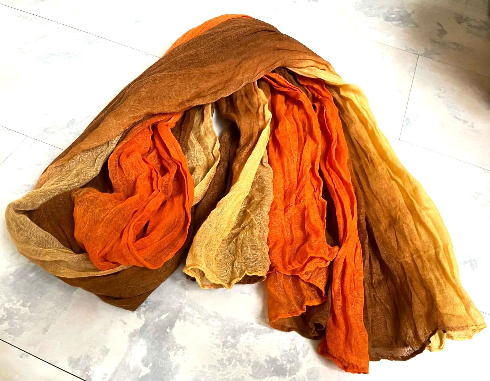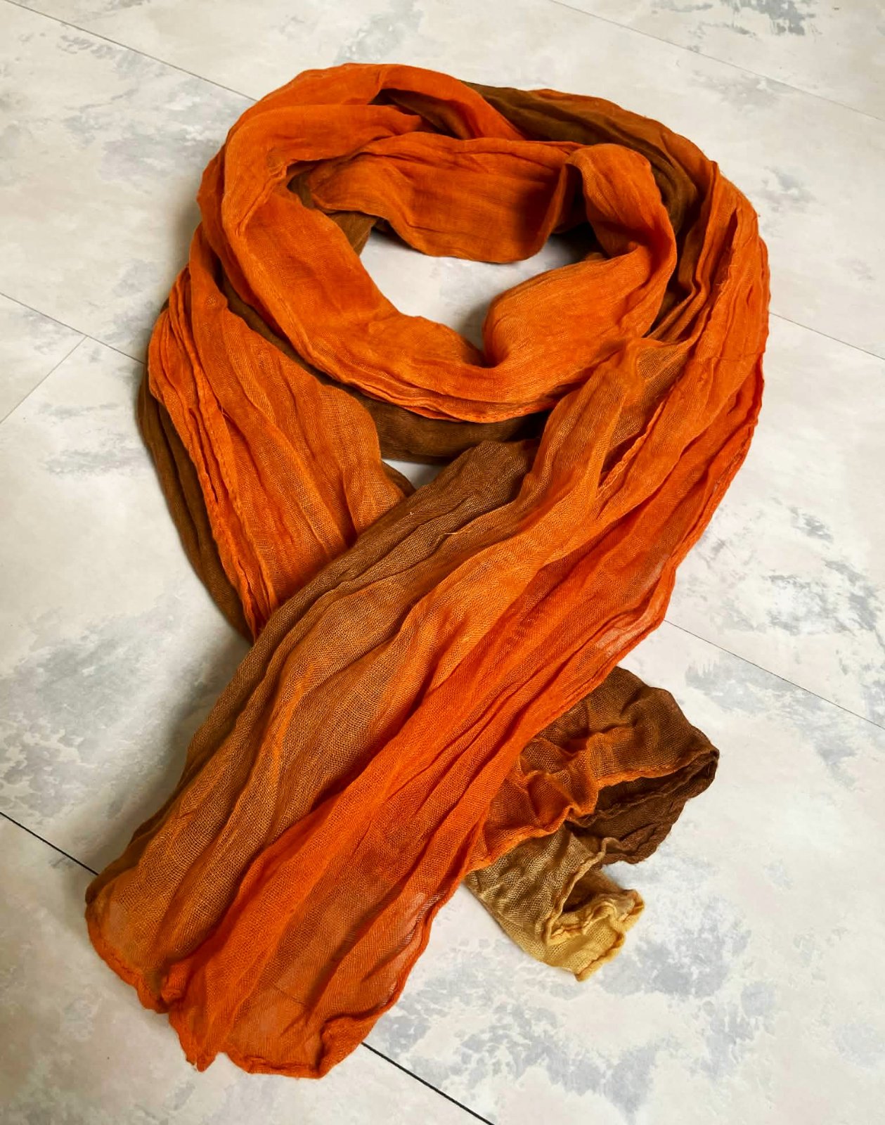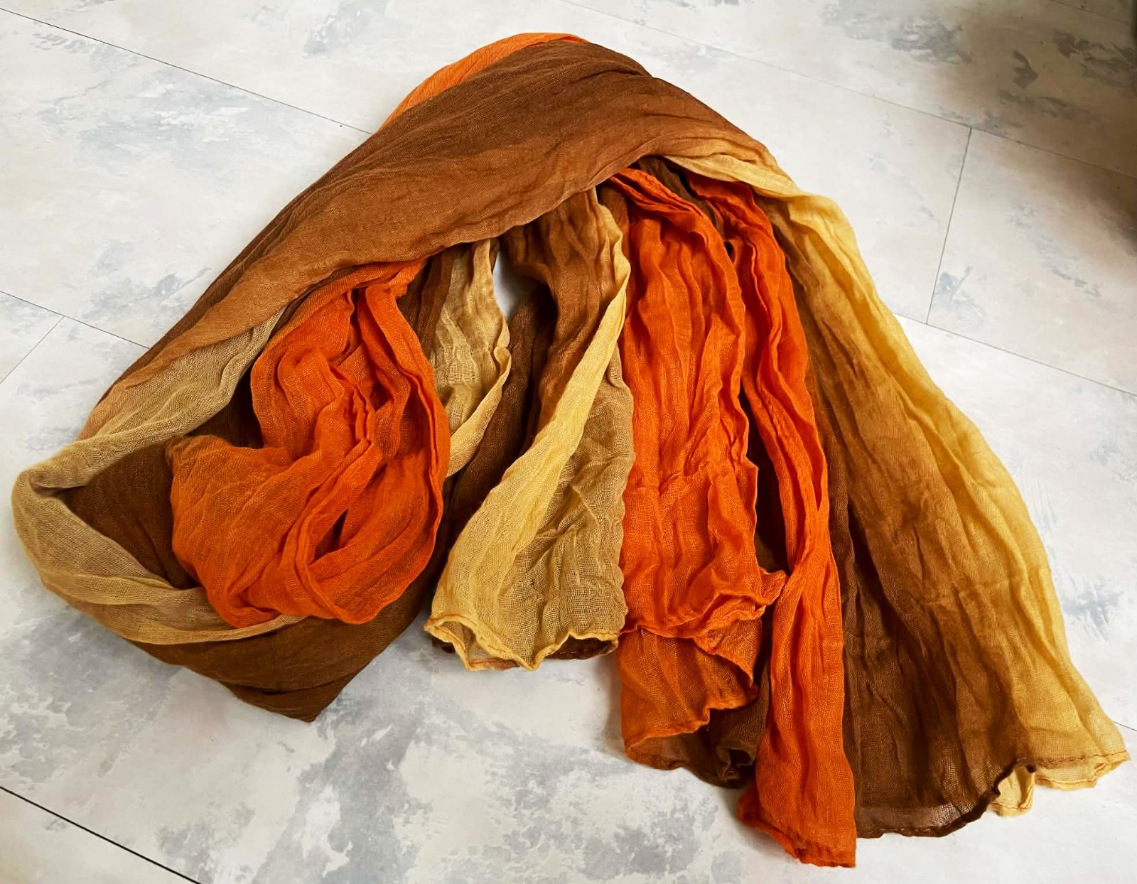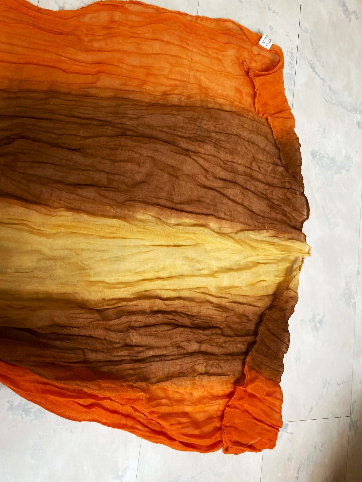 83 x 180 cm,dúhované farby,jesenné zemité farby.Je vyrobená z mačkanej fáčoviny. Pre jeho hrejivé vlastnosti je v obľube v zime i v lete. Efekt vrapovania zachováte tým, keď ho po vypraní zase zmačkáte a necháte ho tak uschnúť.