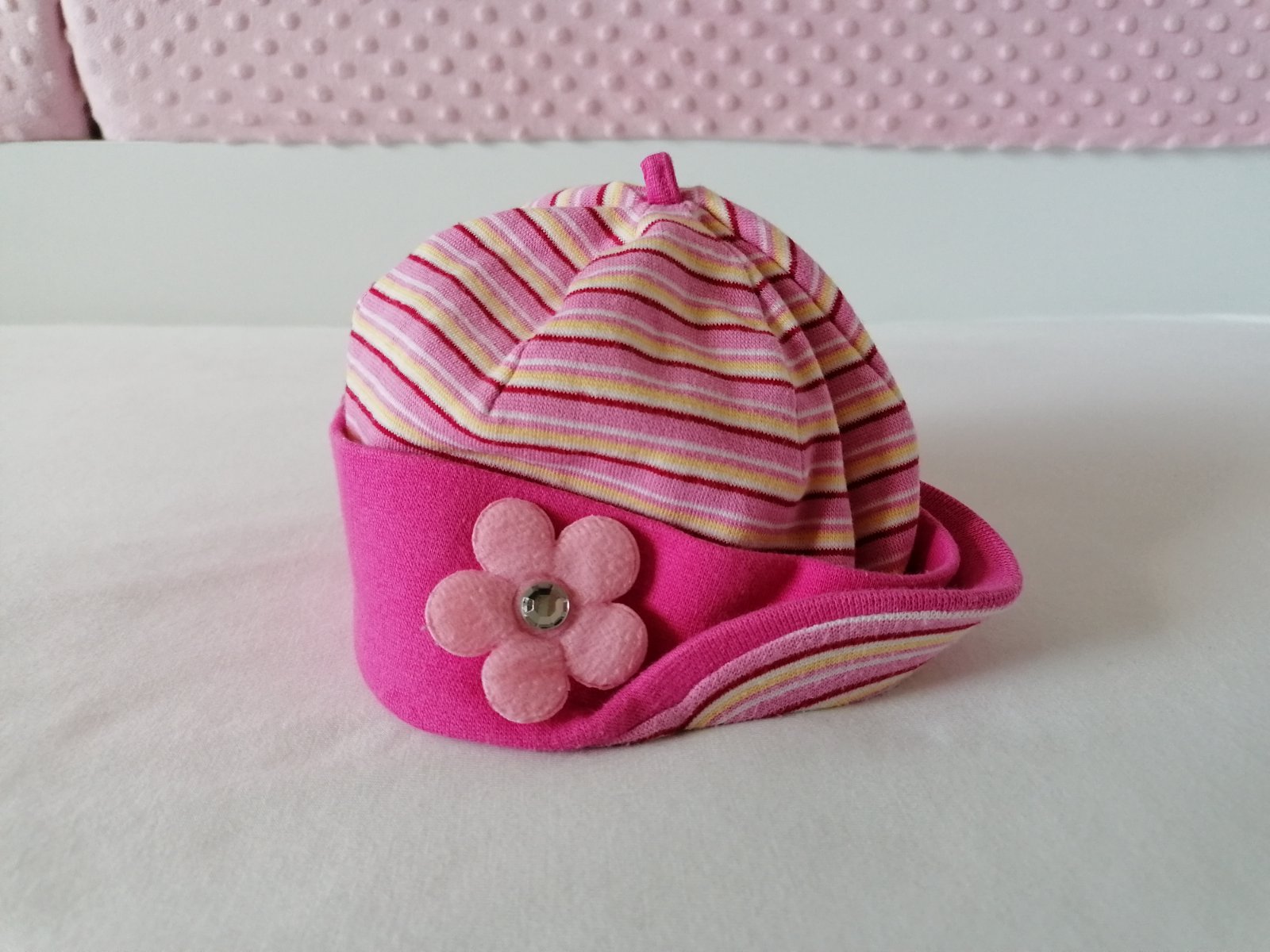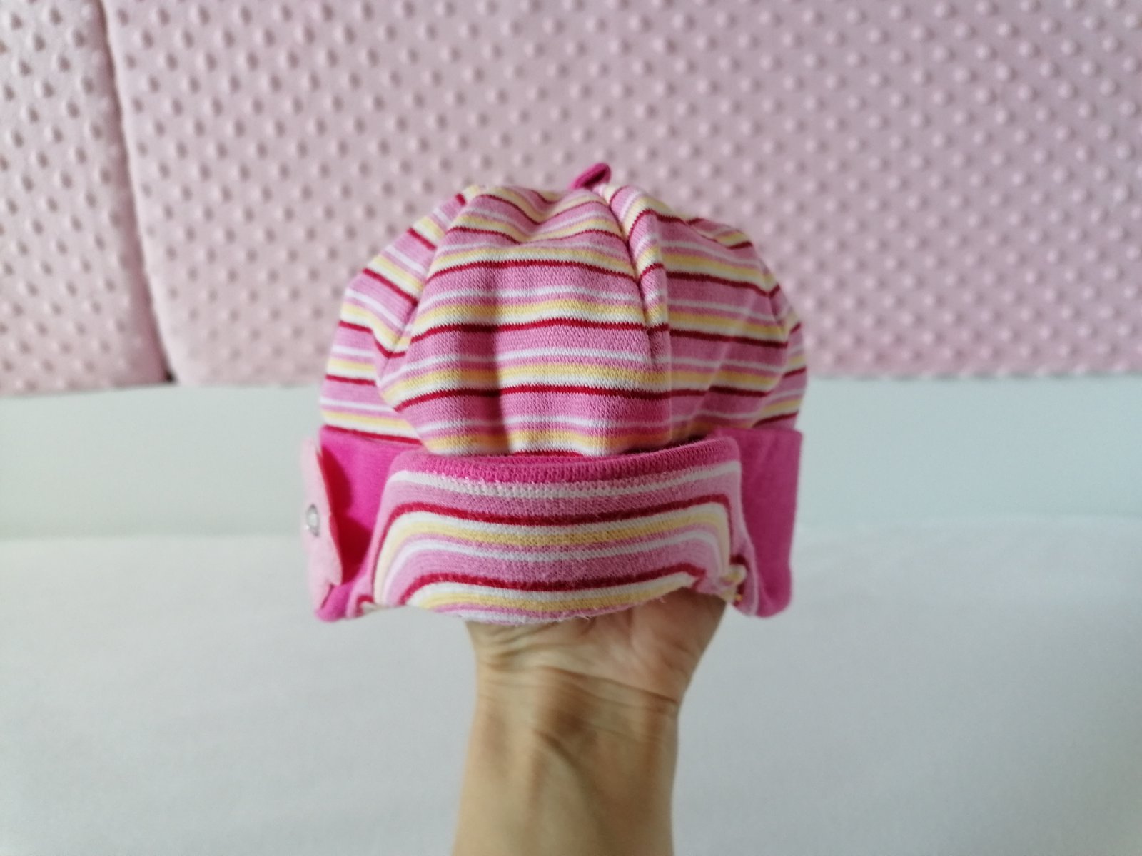 Zaujimava bavlnena ciapocka, velkost podla stitka na obvod hlavicky 52 cm, no najlepsie sedela pri velkosti oblecenia 86-92.