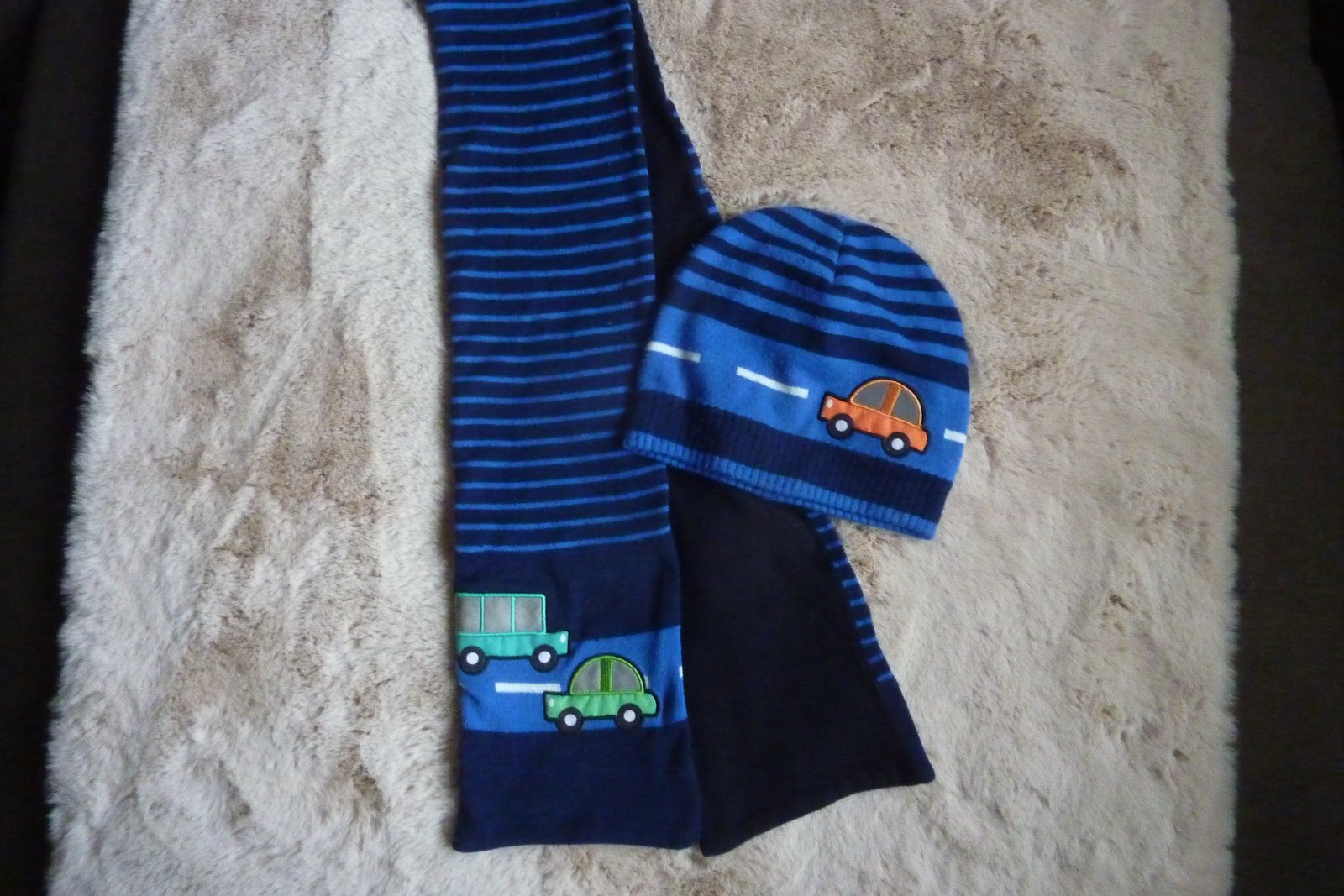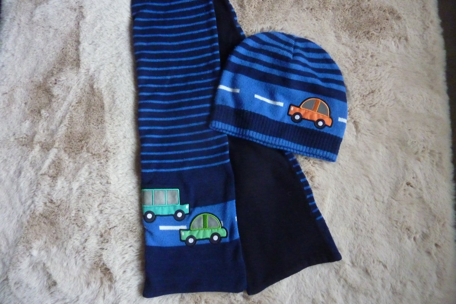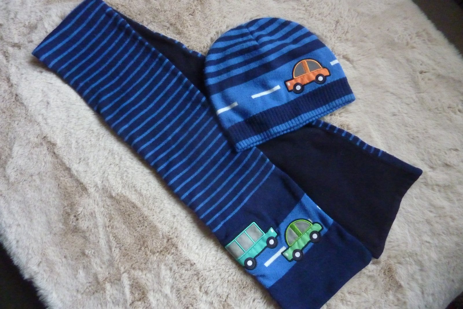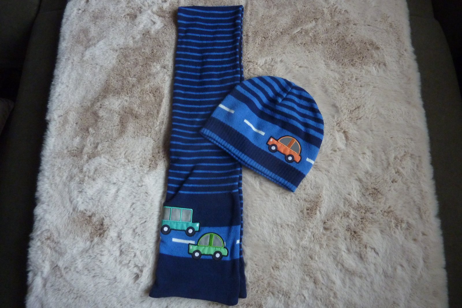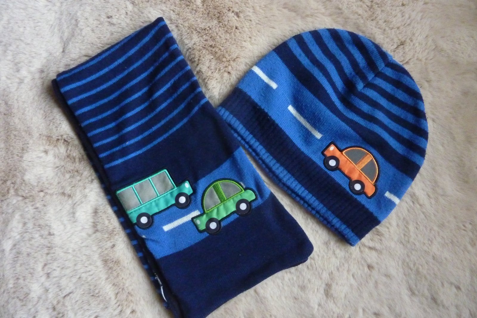 Komplet sálu a čiapky s vyšitými autíčkami, teplé na zimu, hrubý šál, aj čiapka, značkové z obchodu C&A. Chlapčenský, v.128-140.