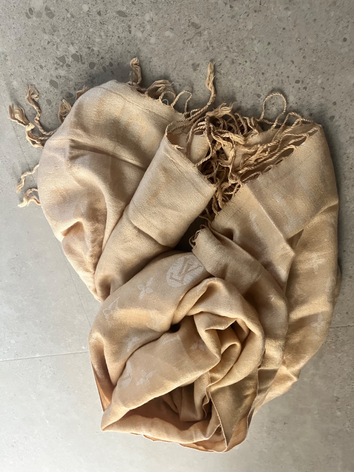 Nenosený Šál maslovej farby, s brmbolcami, tie sa môžu dať dolu. Šály nenosím..
