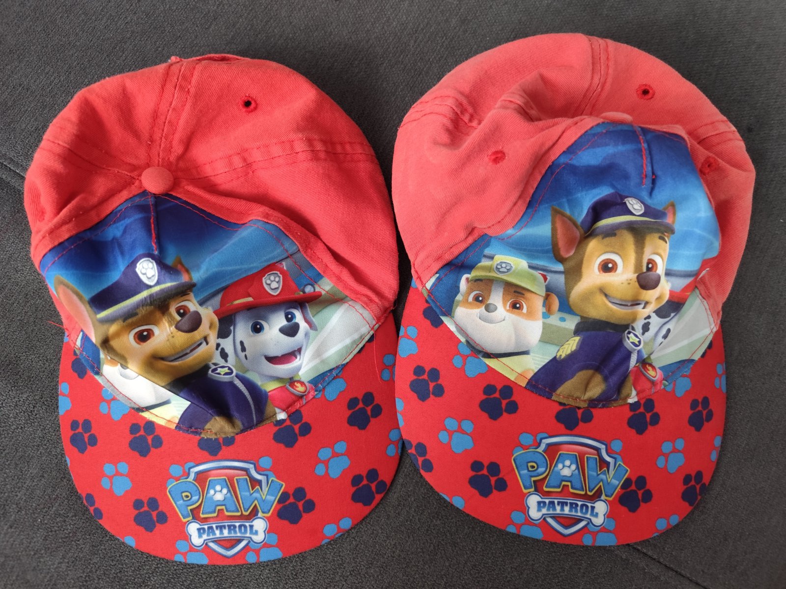 Predám dve úplne rovnaké červené šiltovky Labková patrola, veľkosť 54. Jedna je jemne vyblednutá.