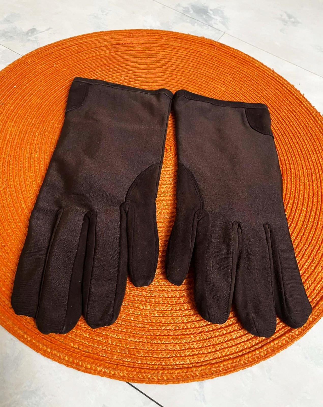 krásne kožené rukavice v úprave jemného nízkovlasého semišu, veľmi zaujímavého strihu,s teplým futrom - pletenina - povrch textilný s vloženými koženými prvkami,veľkosť č. 8