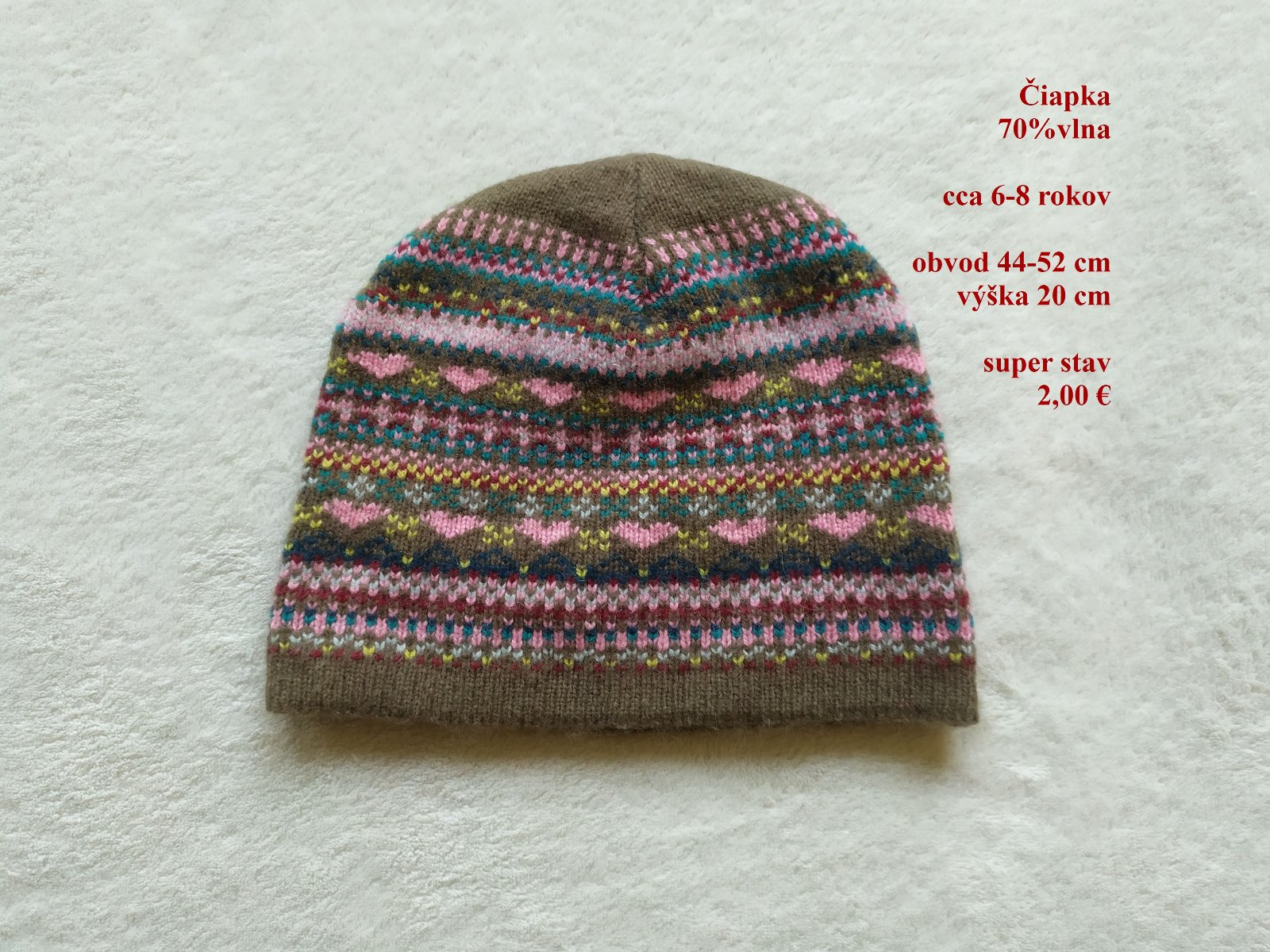 70% vlna, výborný stav bez akýchkoľvek závad, obvod 44-52cm, výška 20cm