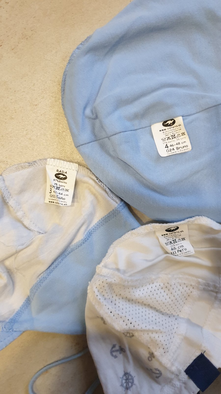 Málo nosené, zn. Rada č. 2, obvod hlavičky 38-40 cm. Jedna má šnúrky na zaväzovanie, druhá patent okolo hlavičky. Cena za kus 2,5 €, spolu 4 €