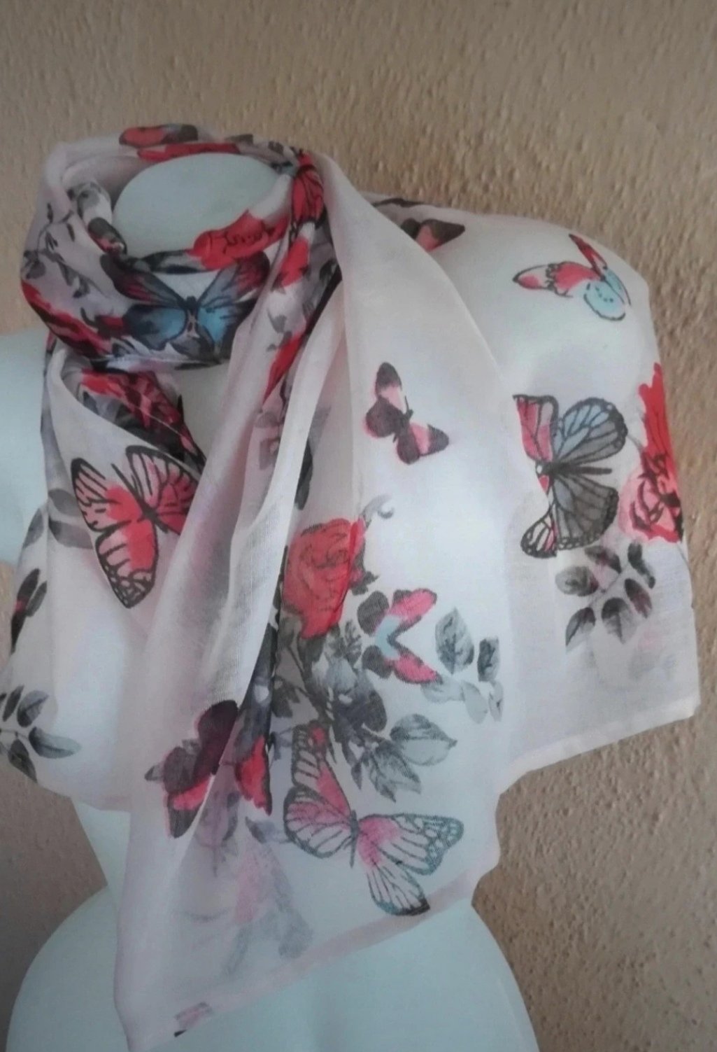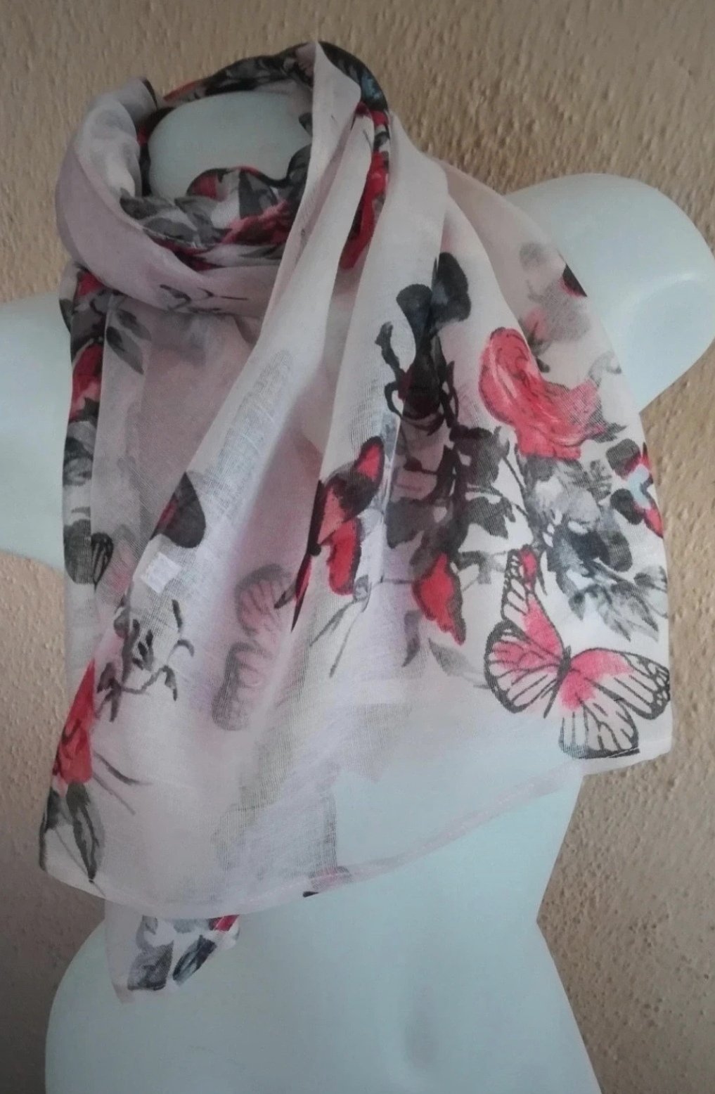 Krásna, elegantná, jemná, dámska šatka vo farbe jemná ružovo fialová, so vzorom motýľov a ruží, nová, nenosená.