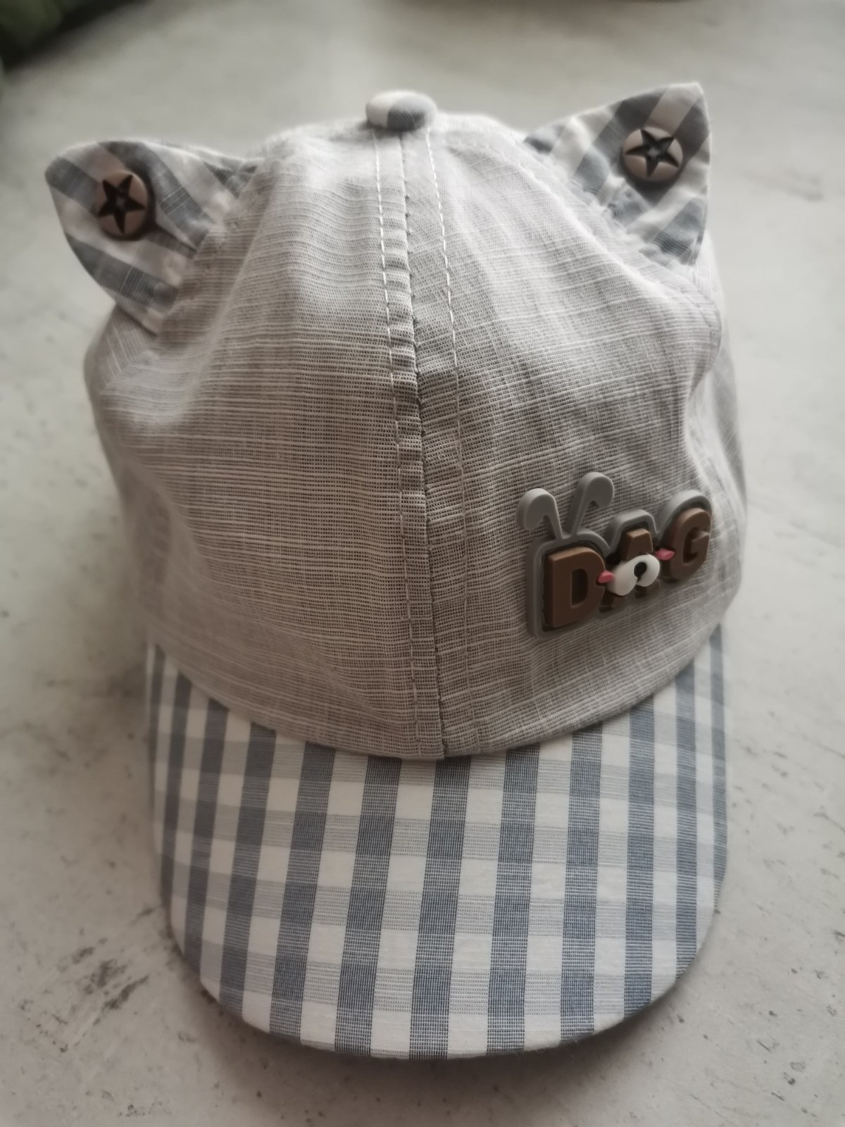 Jemná bavlnená čiapočka so šiltom a prekrytím ušiek na zaväzovanie. Tieto ušká možno vyviazať hore. Vzadu regulovateľná šírka kvôli gumičke, písaná na obvod hlavy 49cm. Veľmi praktická.