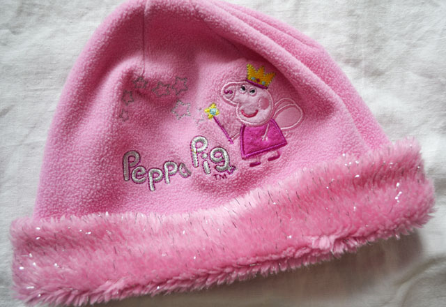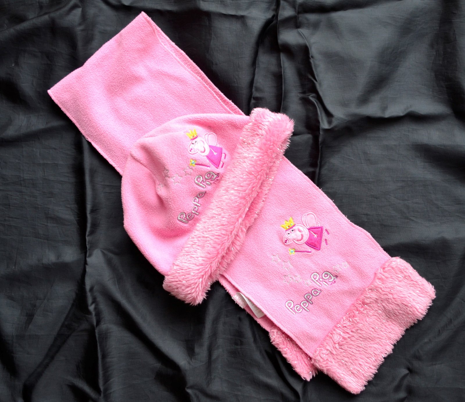 Ružová čiapka s Peppa Pig, olemovaná striebornými nitkami, nosená, veľmi dobrý stav, bez poškodenia. Obvod v kľude 52-53 cm , výška 18 cm