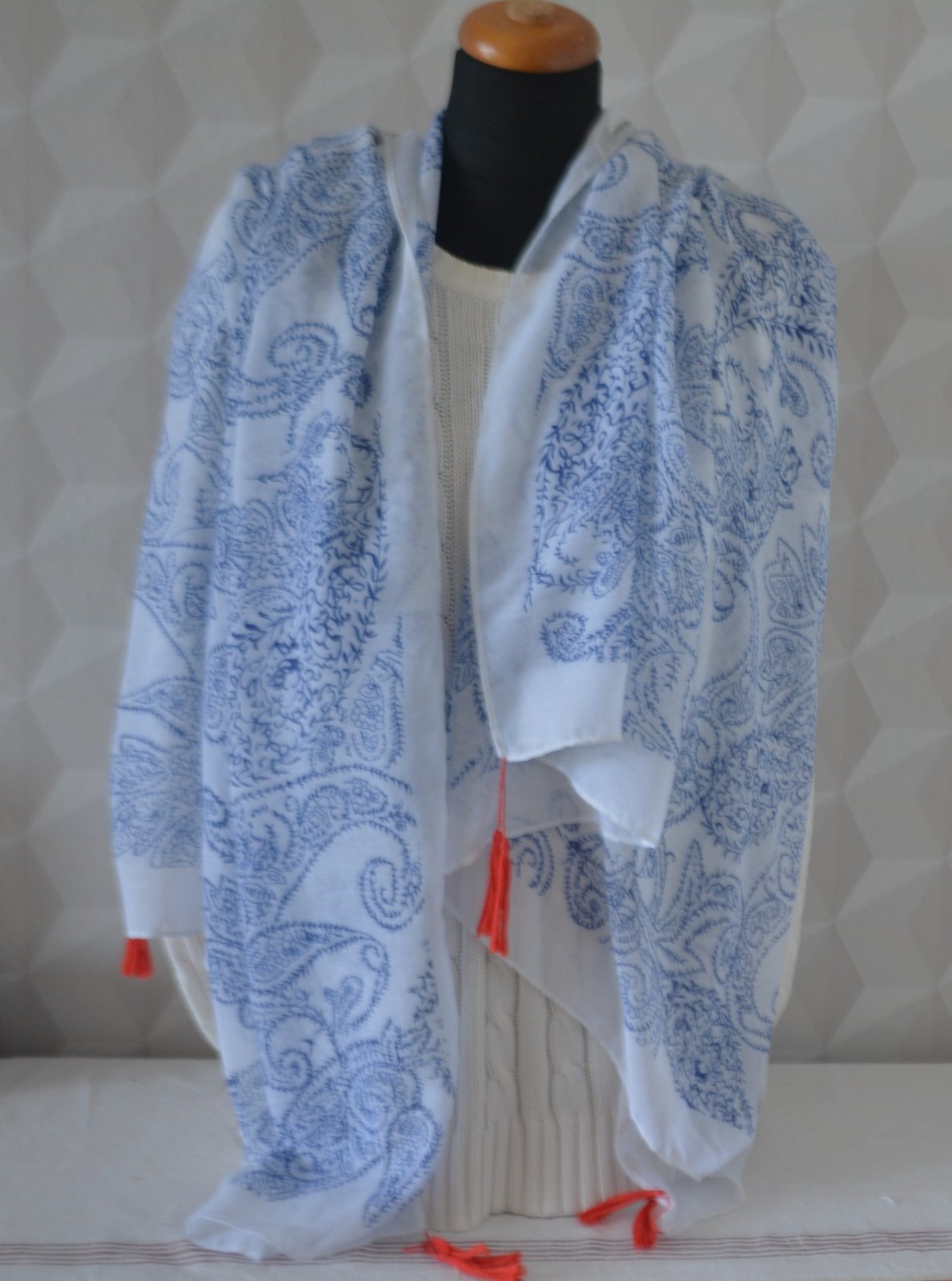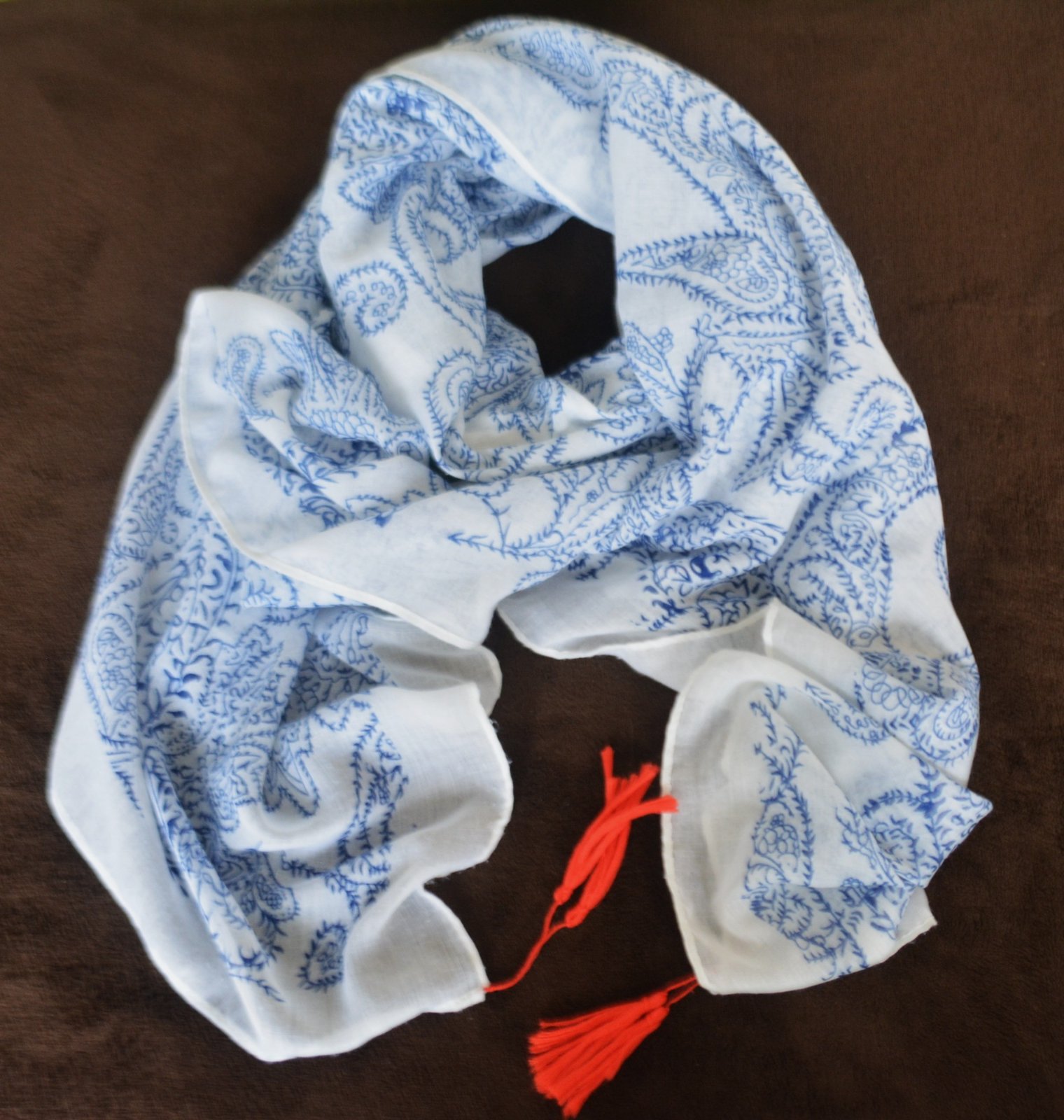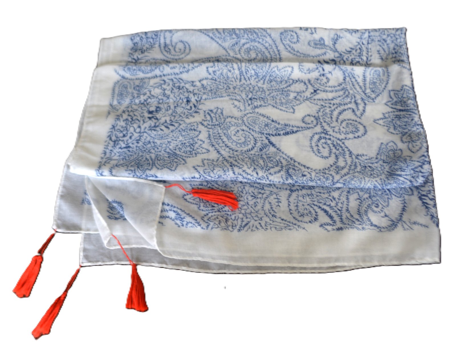 Jemný šál Orsay s modrým paisley vzorom na bielom podklade a červenými strapcami.