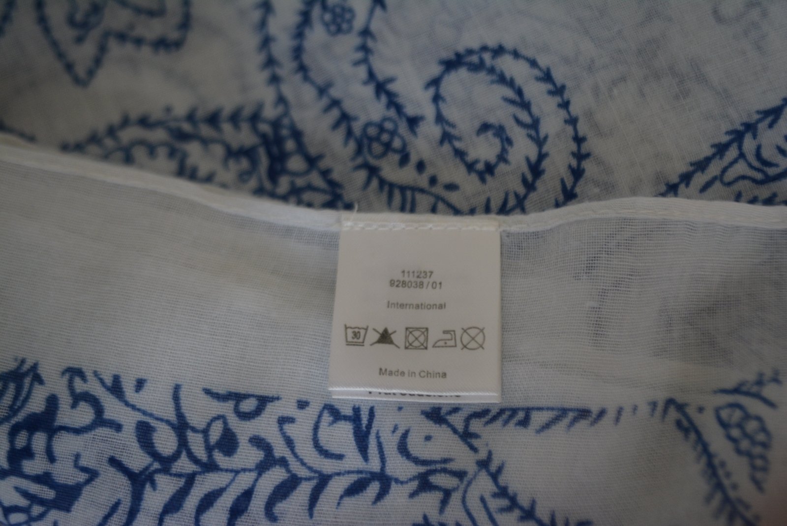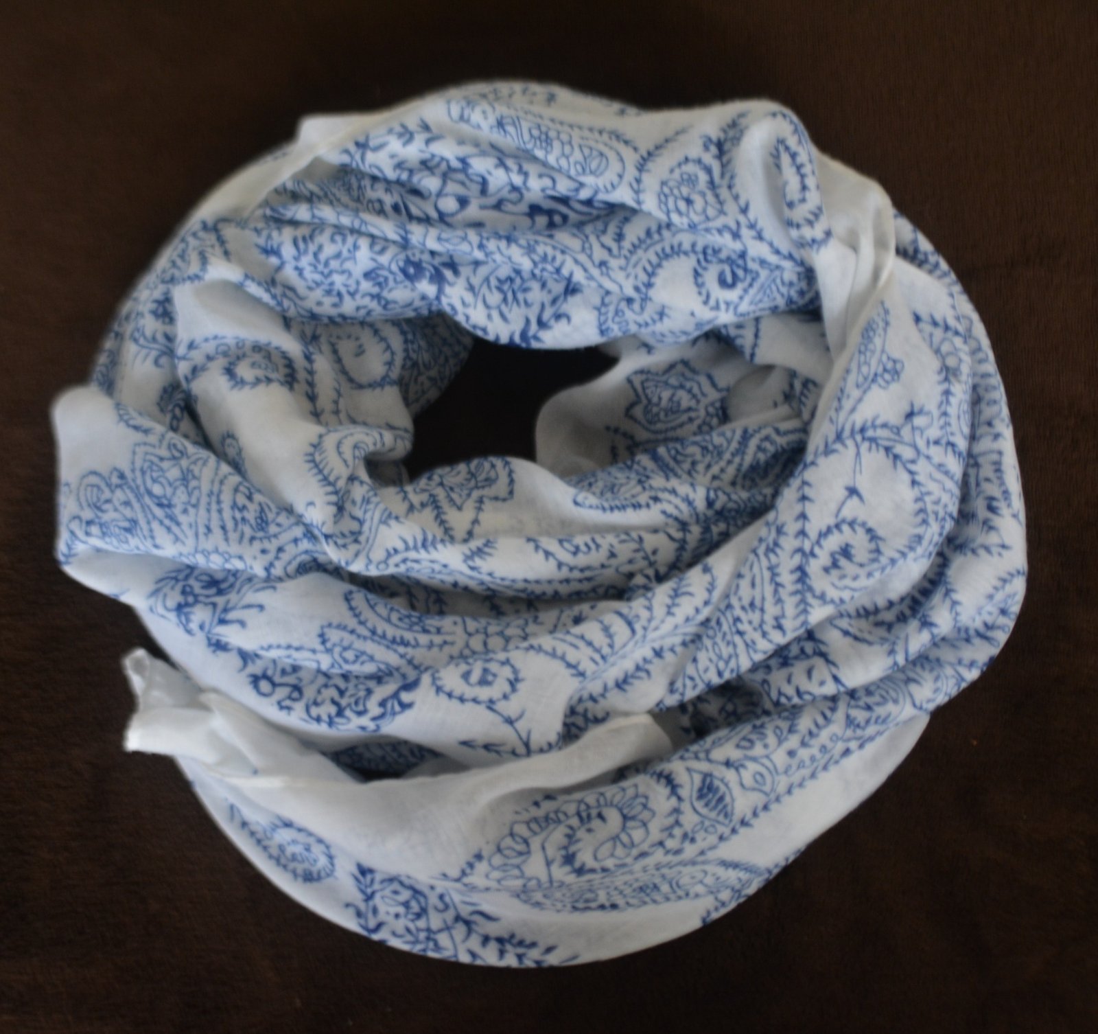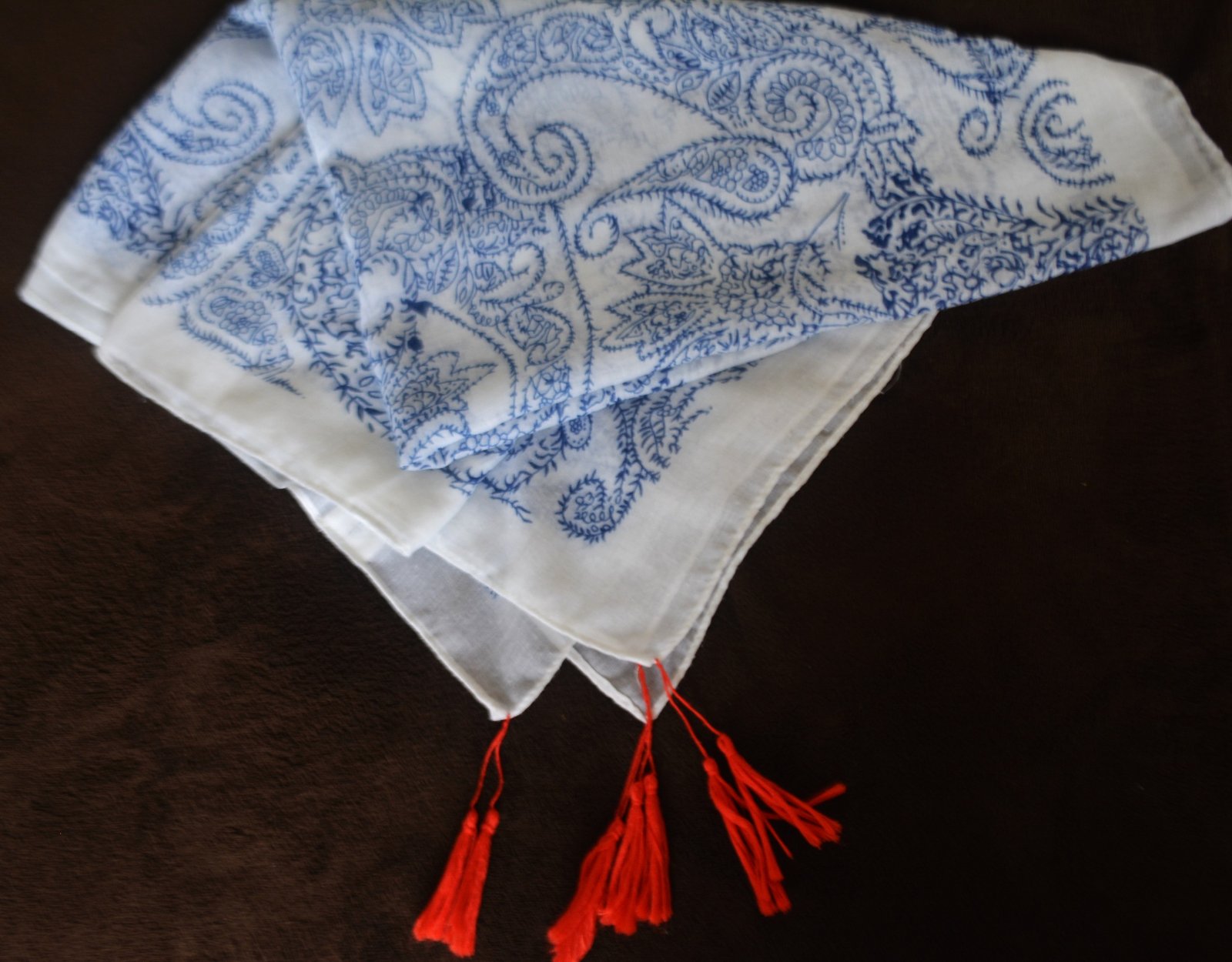 Jemný šál Orsay s modrým paisley vzorom na bielom podklade a červenými strapcami.