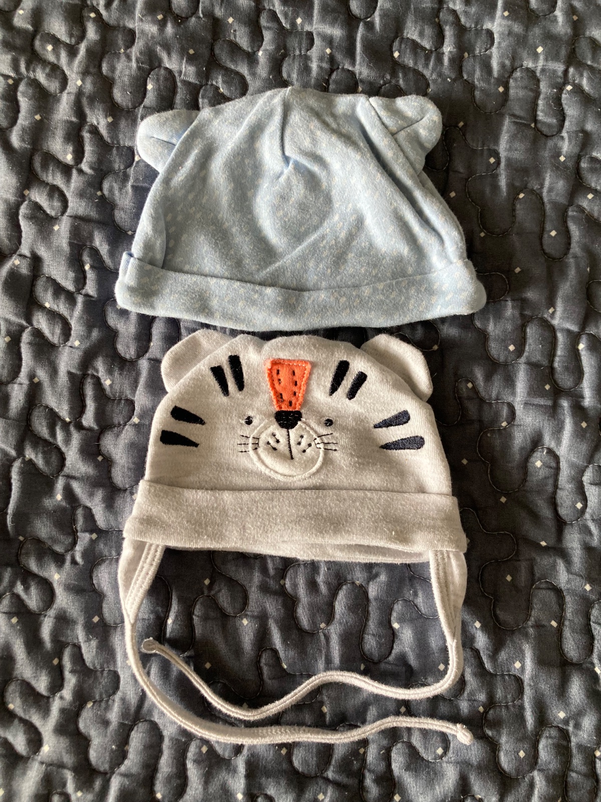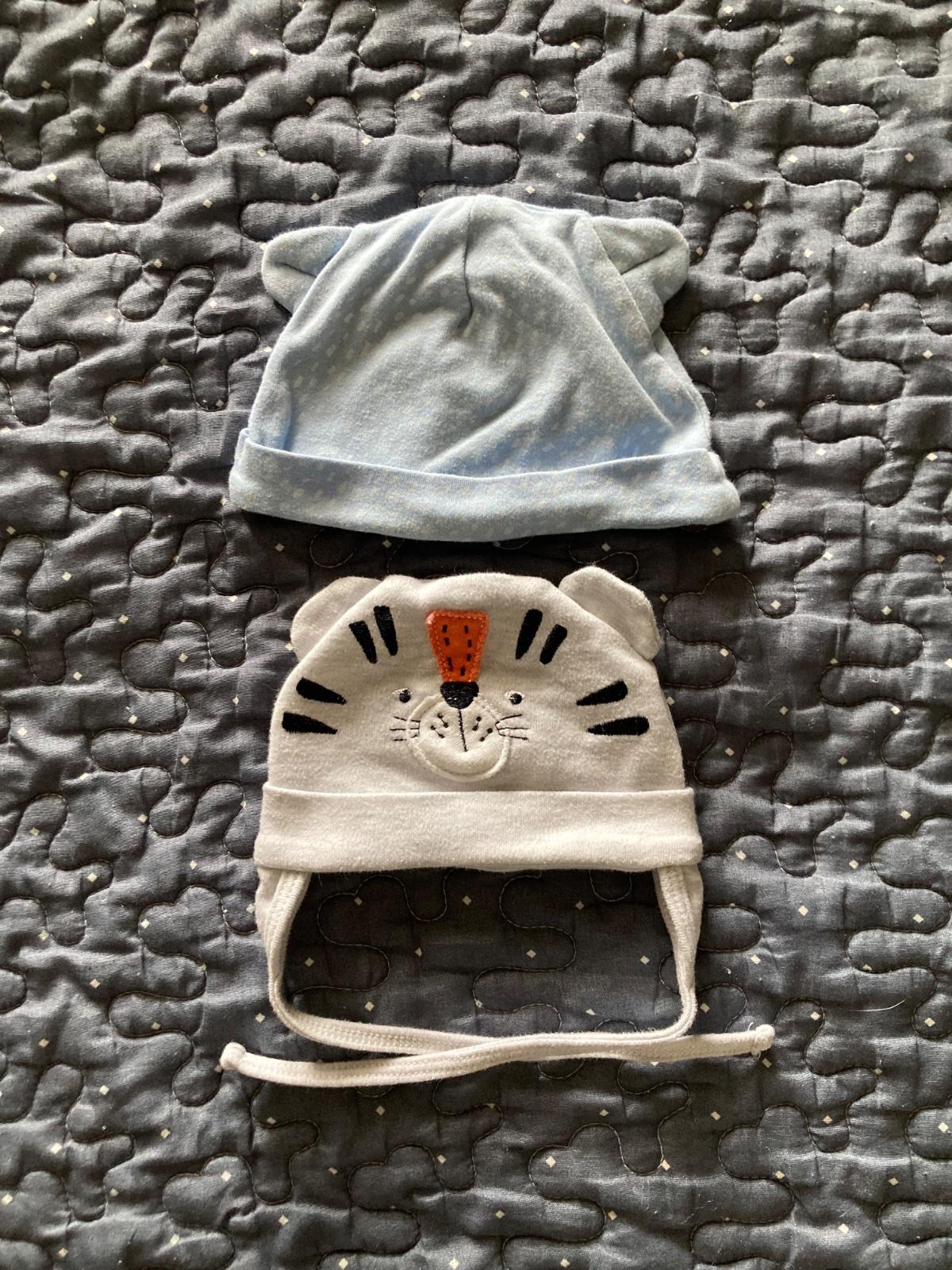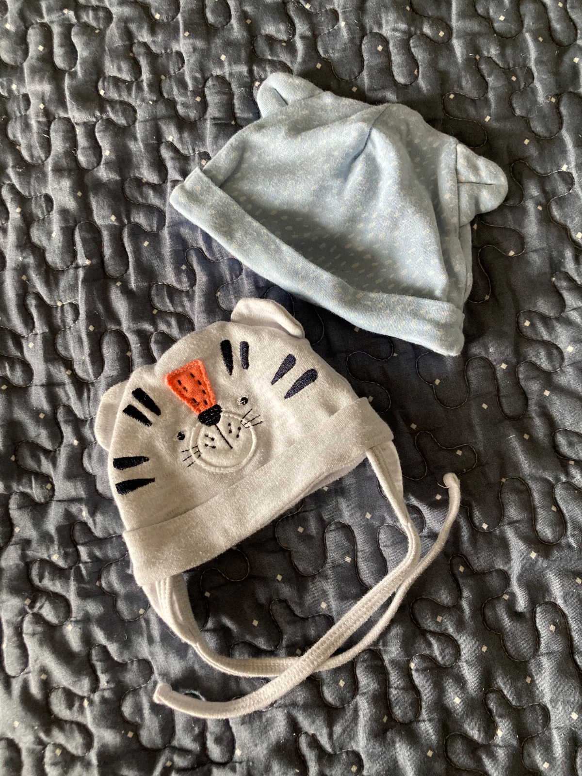 dve bavlnené tenké čiapky, s uškami F and F, s tigríkom So cute