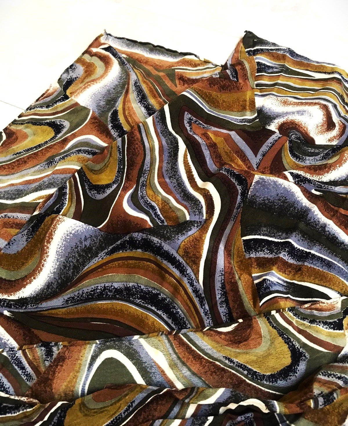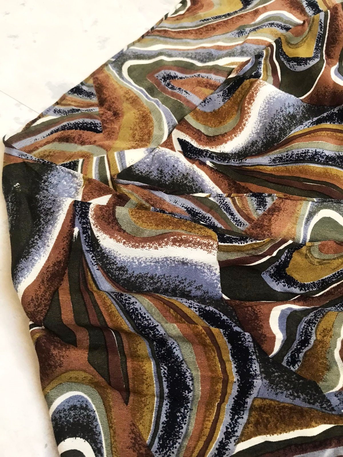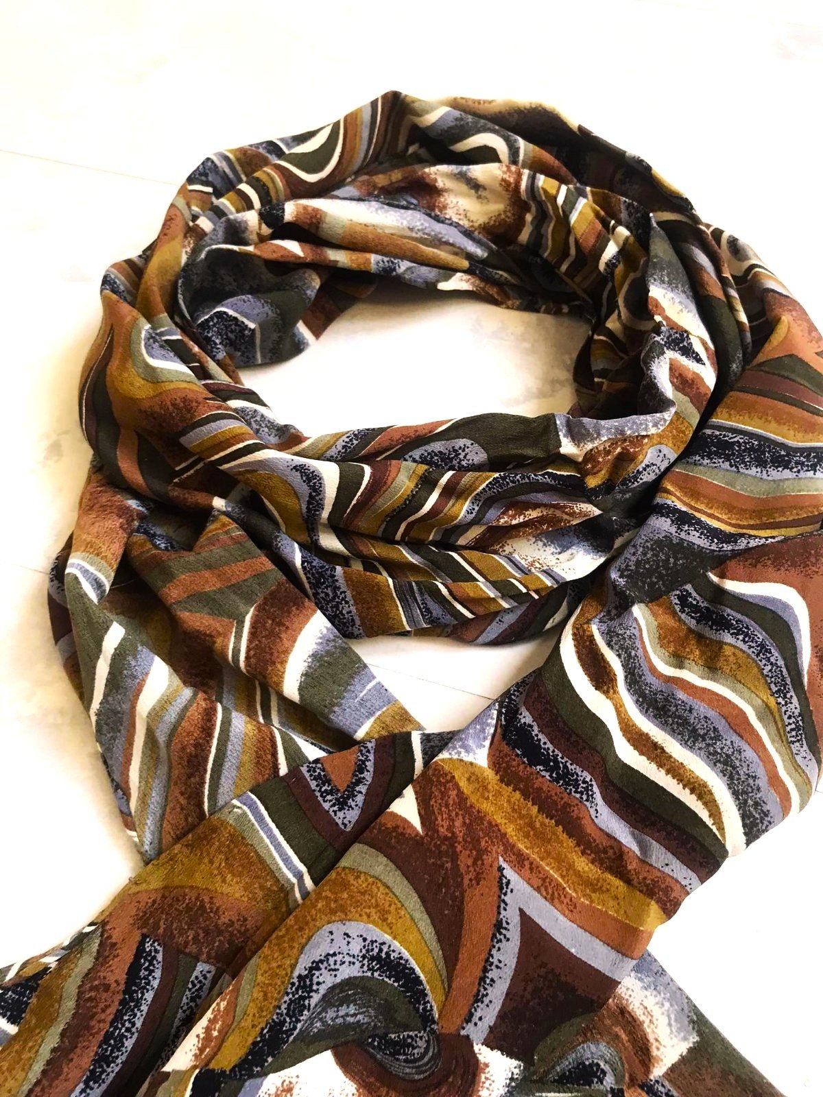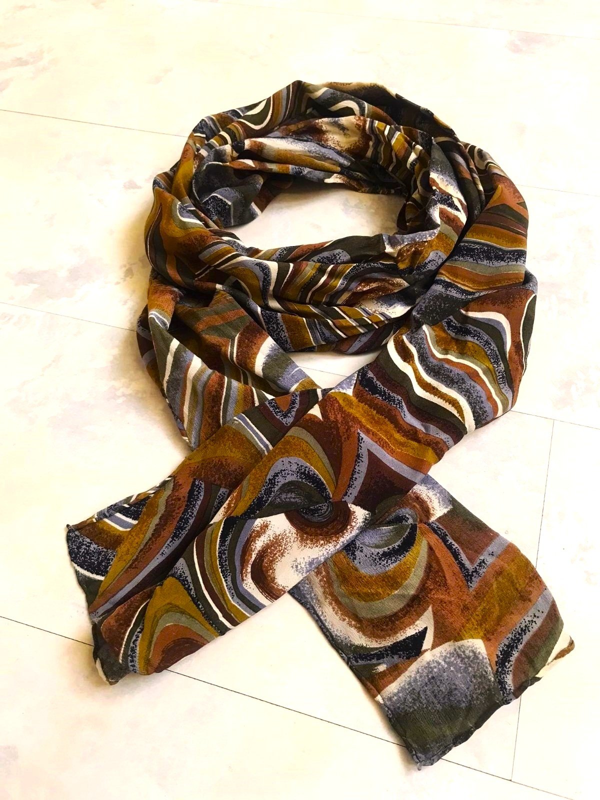 krásna ľahká veľká šatka na krk,jesenné zemité farby, s abstraktným vzorom s vlnovkami v odtieňoch hnedej, sivej, bielej a okrovej farby,zo šifónu, v top stave,170 x 35 cm