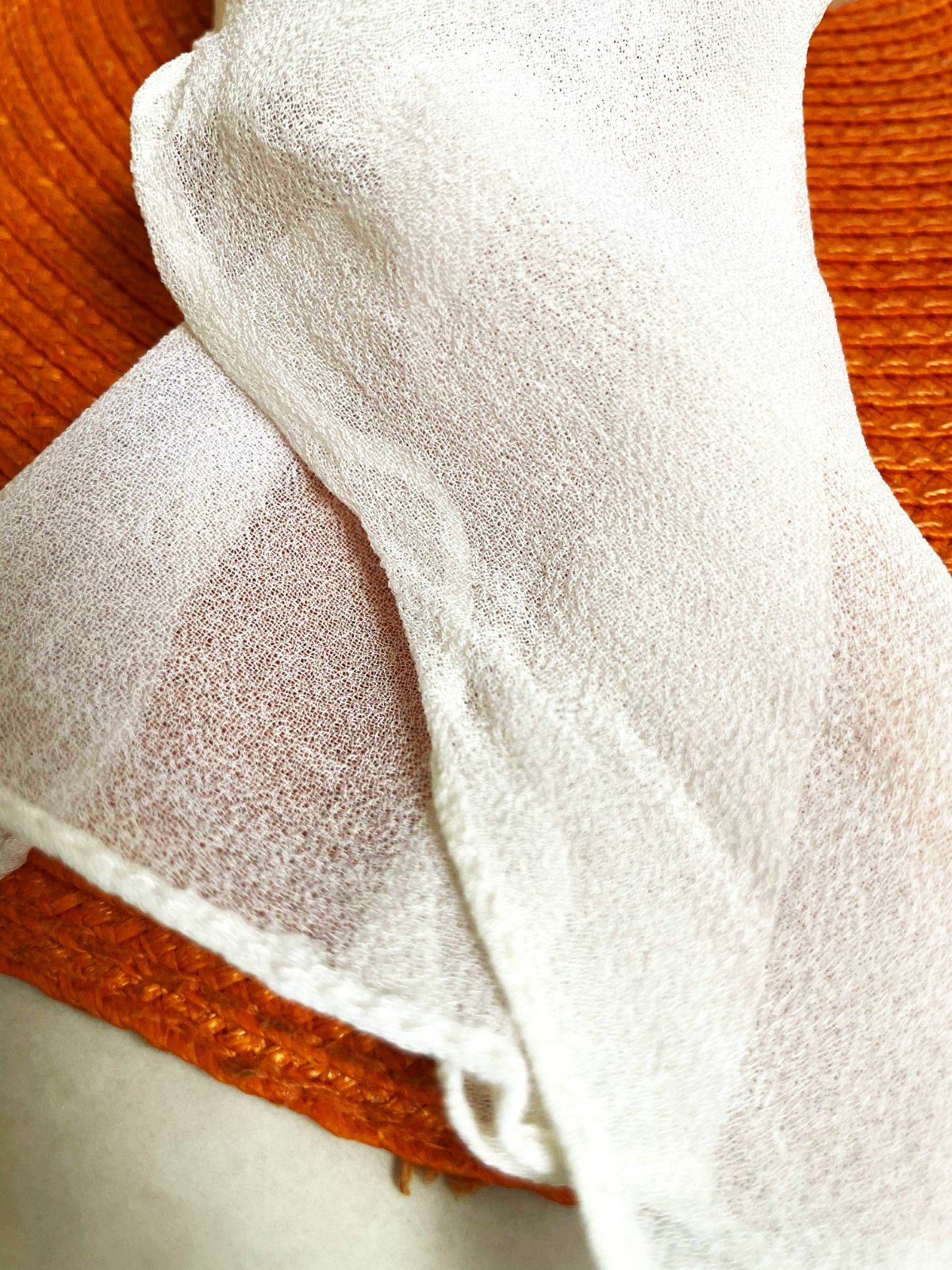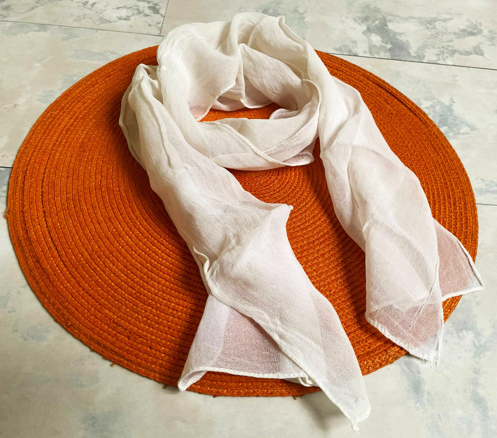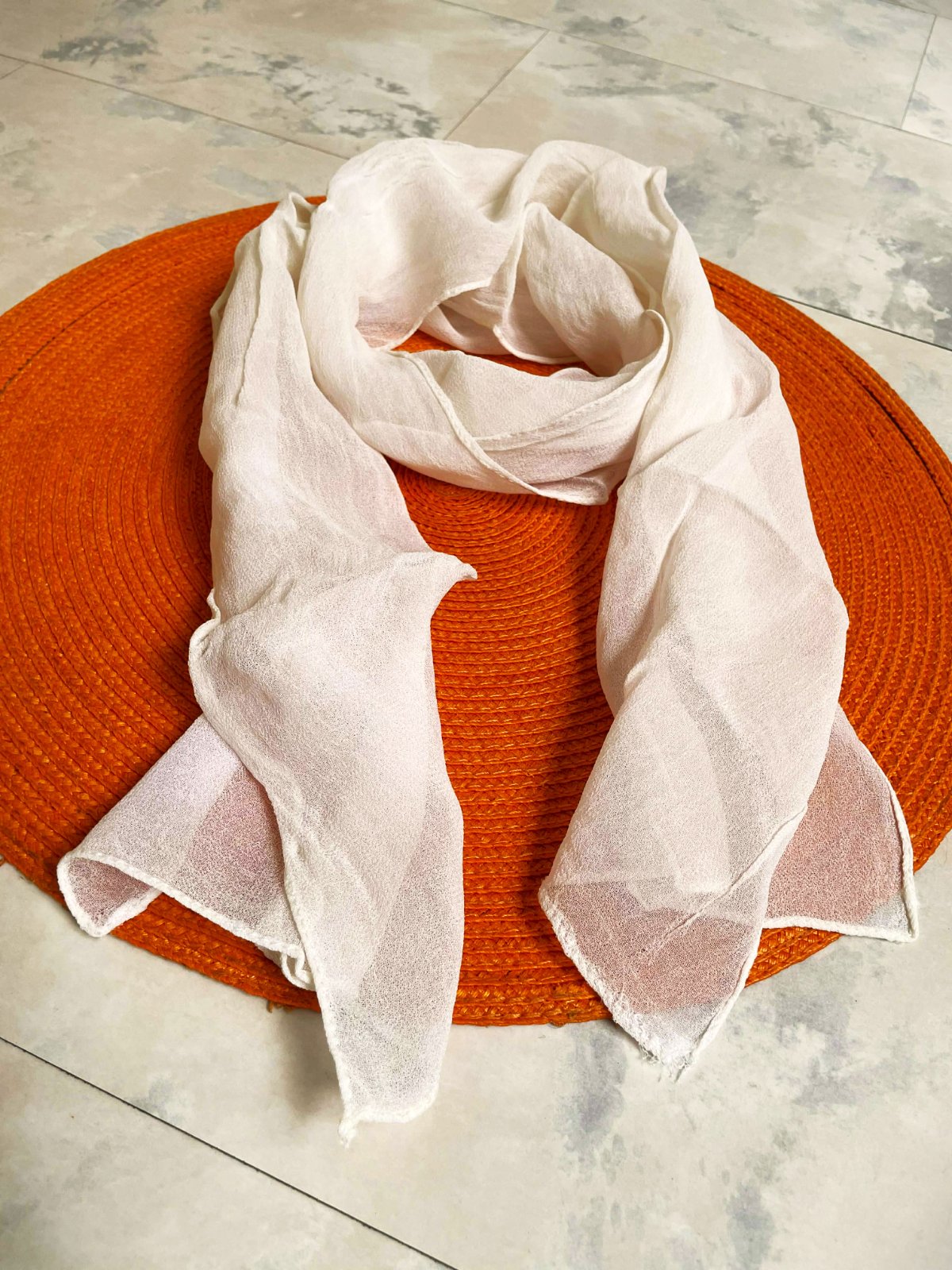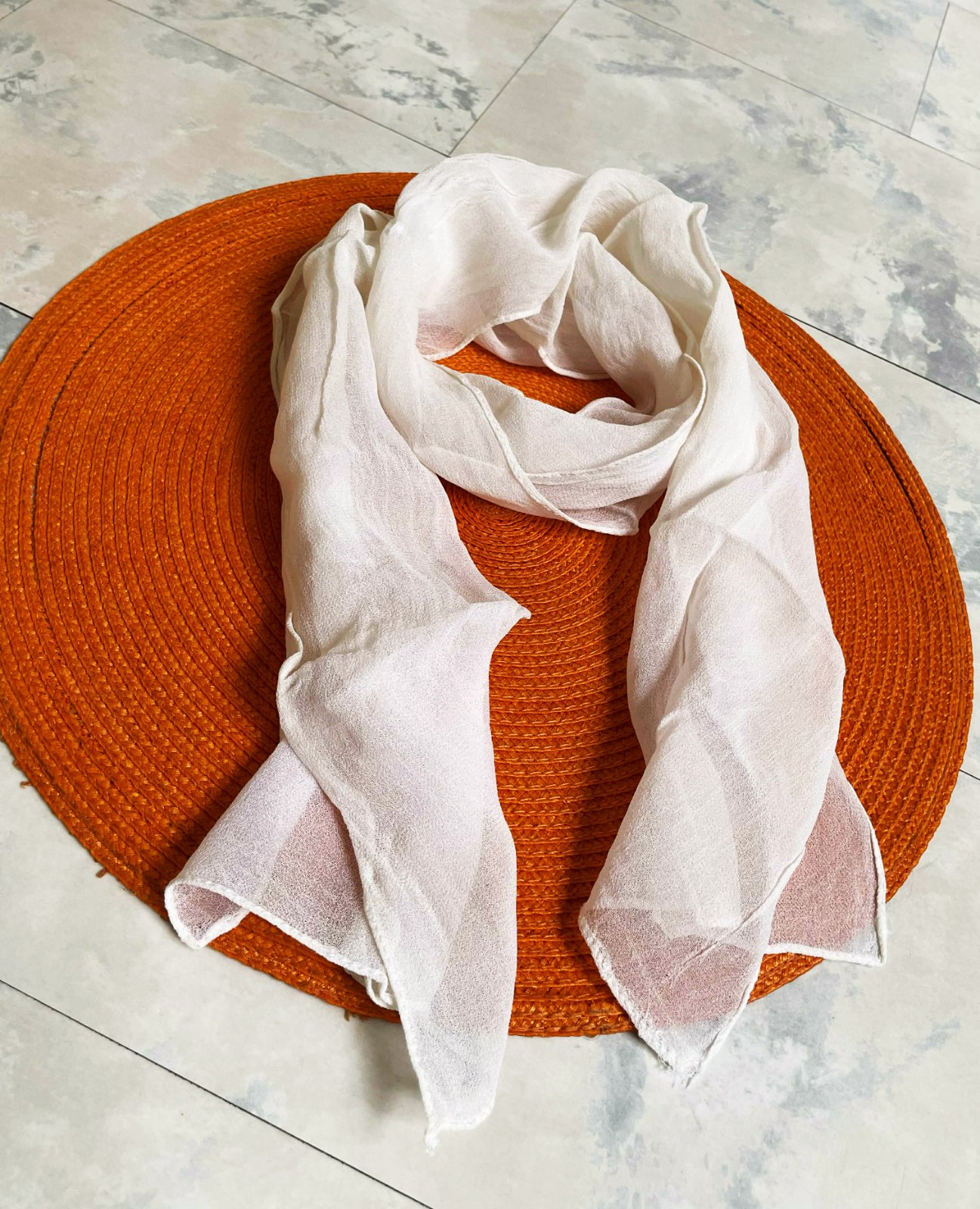 jemnučký, tenký, jemne priesvitný,vhodný nosiť okolo krku,110 x 25 cm,farba smotanovo biela.Efekt vrapovania zachováte tým, keď ho po vypraní zase zmačkáte a necháte ho tak uschnúť.